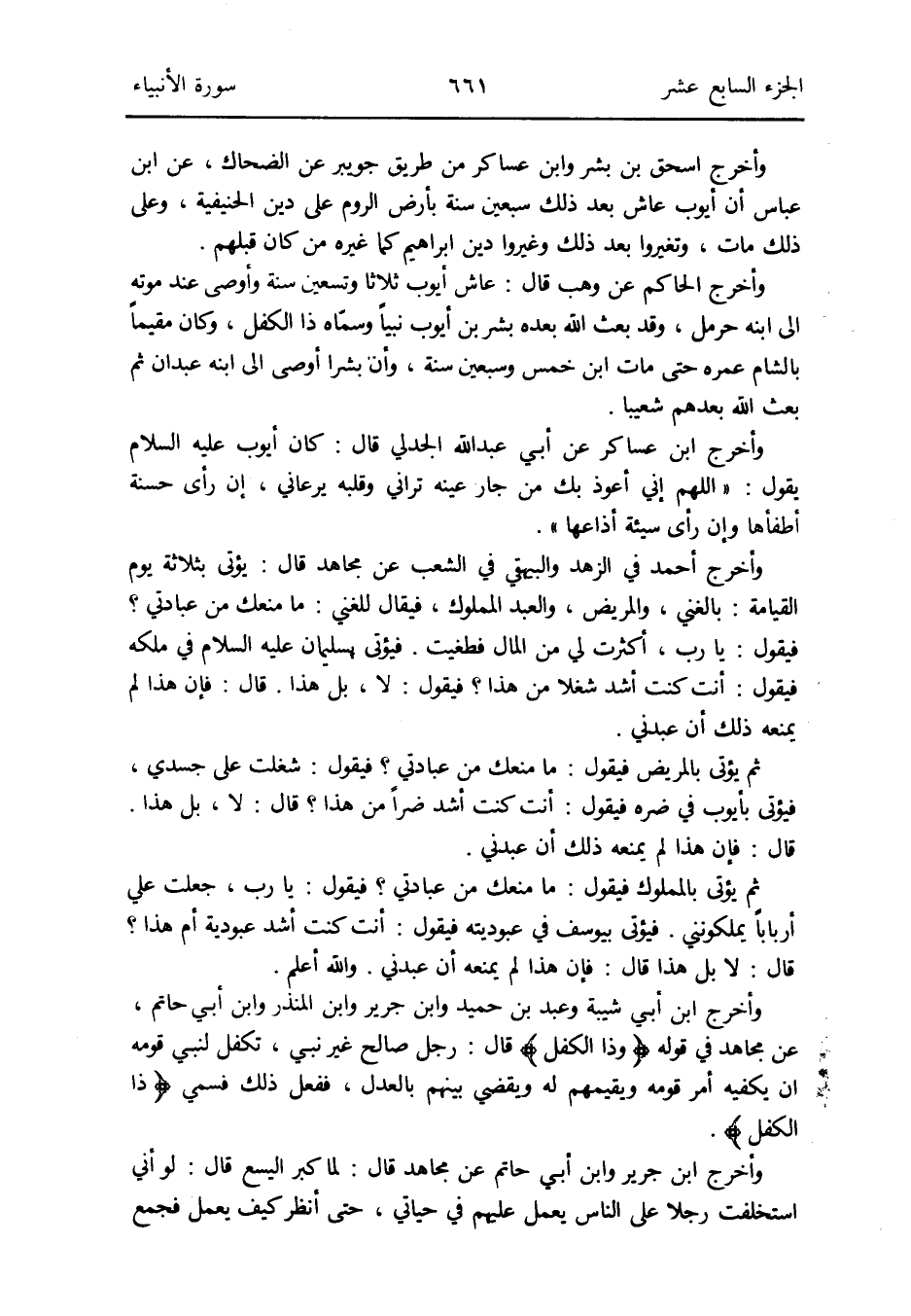 وَأخرج ابْن أبي شيبَة وَعبد بن حميد وَابْن جرير وَابْن الْمُنْذر وَابْن أبي حَاتِم عَن مُجَاهِد فِي قَوْله: {وَذَا الكفل} قَالَ: رجل صَالح غير نَبِي تكفل لنَبِيّ قومه أَن يَكْفِيهِ أَمر قومه ويقيمهم لَهُ وَيَقْضِي بَينهم بِالْعَدْلِ فَفعل ذَلِك فَسُمي {وَذَا الكفل}