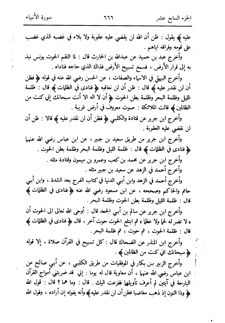 وَأخرج ابْن جرير من طَرِيق سعيد بن جُبَير عَن ابْن عَبَّاس رَضِي الله عَنْهُمَا {فَنَادَى فِي الظُّلُمَات} قَالَ: ظلمَة اللَّيْل وظلمة الْبَحْر وظلمة بطن الْحُوت