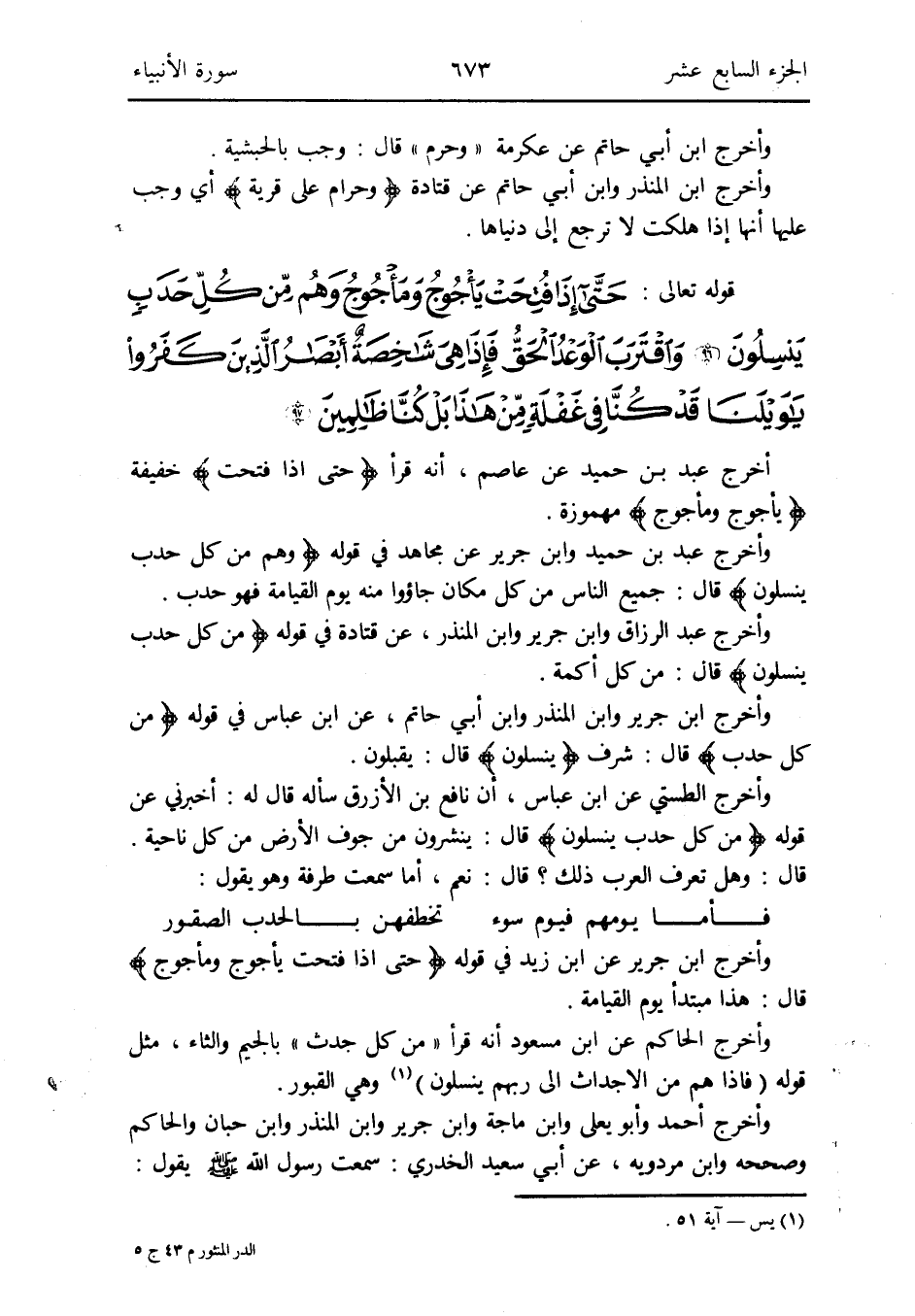 وَأخرج الطستي عَن ابْن عَبَّاس أَن نَافِع بن الْأَزْرَق سَأَلَهُ قَالَ لَهُ: أَخْبرنِي عَن قَوْله: {من كل حدب يَنْسلونَ} قَالَ: ينشرون من جَوف الأَرْض من كل نَاحيَة