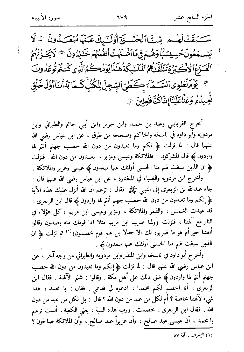 وَأخرج ابْن مرْدَوَيْه والضياء فِي المختارة عَن ابْن عَبَّاس رَضِي الله عَنْهُمَا قَالَ: جَاءَ عبد الله بن الزِّبَعْرَى إِلَى النَّبِي صلى الله عَلَيْهِ وَسلم فَقَالَ: تزْعم أَن الله أنزل عَلَيْك هَذِه الْآيَة {إِنَّكُم وَمَا تَعْبدُونَ من دون الله حصب جَهَنَّم أَنْتُم لَهَا وَارِدُونَ} قَالَ ابْن الزِّبَعْرَى: قد عبدت الشَّمْس وَالْقَمَر وَالْمَلَائِكَة وعزير وَعِيسَى ابْن مَرْيَم كل هَؤُلَاءِ فِي النَّار مَعَ آلِهَتنَا فَنزلت (وَلما ضرب ابْن مَرْيَم مثلا إِذا قَوْمك مِنْهُ يصدون) وَقَالُوا أآلهتنا خير أم هُوَ مَا ضربوه لَك إِلَّا جدلاً بل هم قوم خصمون) (الزخرف آيَة 57) ثمَّ نزلت {إِن الَّذين سبقت لَهُم منا الْحسنى أُولَئِكَ عَنْهَا مبعدون}