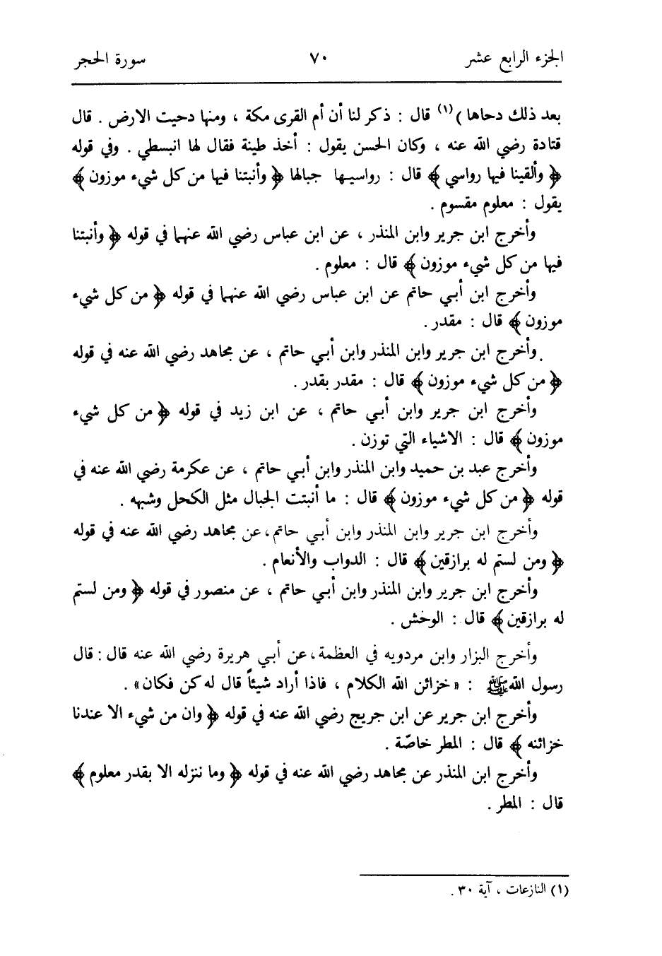 وَأخرج ابْن جرير وَابْن الْمُنْذر عَن ابْن عَبَّاس رَضِي الله عَنْهُمَا فِي قَوْله: {وأنبتنا فِيهَا من كل شَيْء مَوْزُون} قَالَ: مَعْلُوم