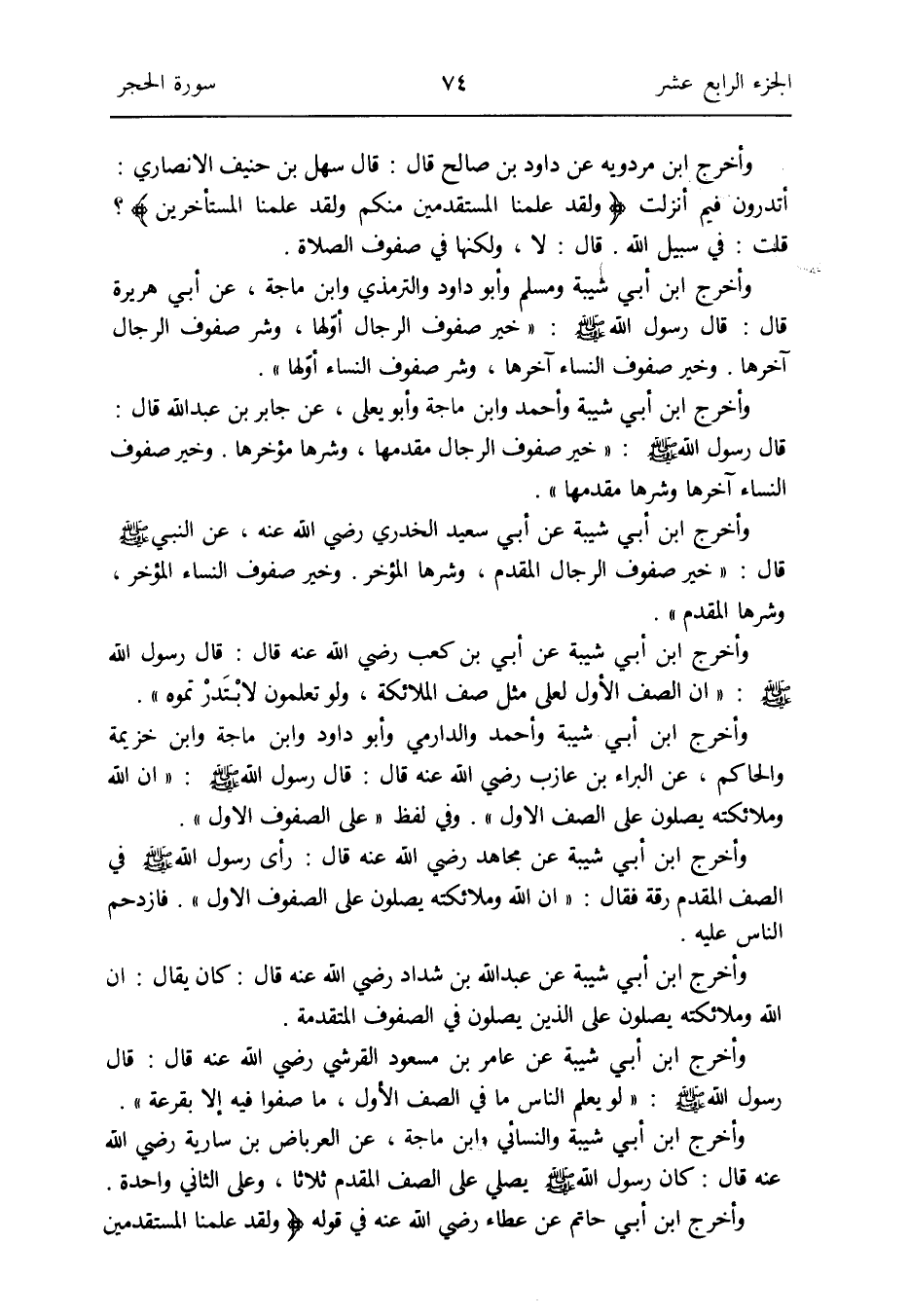 وَأخرج ابْن أبي شيبَة وَأحمد وَابْن ماجة وَأَبُو يعلى عَن جَابر بن عبد الله قَالَ: قَالَ رَسُول الله صلى الله عَلَيْهِ وَسلم: خير صُفُوف الرِّجَال مقدمها وشرها مؤخرها