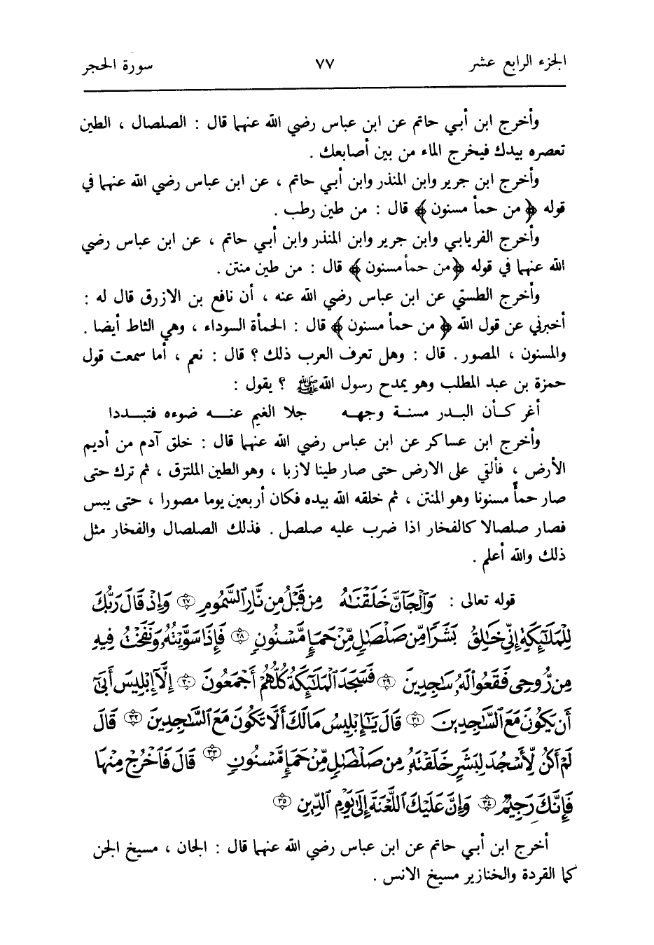 وَأخرج الْفرْيَابِيّ وَابْن جرير وَابْن الْمُنْذر وَابْن أبي حَاتِم عَن ابْن عَبَّاس رَضِي الله عَنْهُمَا فِي قَوْله: {من حمإ مسنون} قَالَ: من طين منتن