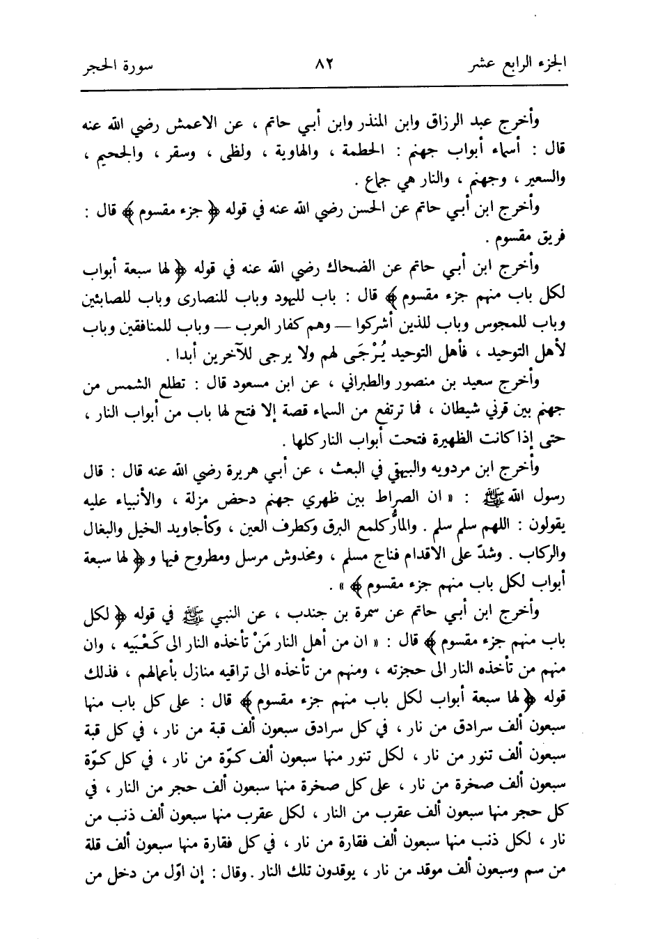وَأخرج ابْن أبي حَاتِم عَن سَمُرَة بن جُنْدُب عَن النَّبِي صلى الله عَلَيْهِ وَسلم فِي قَوْله: {لكل بَاب مِنْهُم جُزْء مقسوم} قَالَ: إِن من أهل النَّار مَنْ تَأْخُذهُ النَّار إِلَى كَعْبَيه وَإِن مِنْهُم من تَأْخُذهُ النَّار إِلَى حجزته وَمِنْهُم من تَأْخُذهُ إِلَى تراقيه منَازِل بأعمالهم فَذَلِك قَوْله: {لَهَا سَبْعَة أَبْوَاب لكل بَاب مِنْهُم جُزْء مقسوم} قَالَ: على كل بَاب مِنْهَا سَبْعُونَ ألف سرادق من نَار فِي كل سرادق سَبْعُونَ ألف قبَّة من نَار فِي كل قبَّة سَبْعُونَ ألف تنور من نَار لكل تنور مِنْهَا سَبْعُونَ ألف كوّة من نَار فِي كل كوّة سَبْعُونَ ألف صَخْرَة من نَار على كل صَخْرَة مِنْهَا سَبْعُونَ ألف حجر من النَّار فِي كل حجر مِنْهَا سَبْعُونَ ألف عقرب من النَّار لكل عقرب مِنْهَا سَبْعُونَ ألف ذَنْب من نَار لكل ذَنْب مِنْهَا سَبْعُونَ ألف فقارة من نَار فِي كل فقارة مِنْهَا سَبْعُونَ ألف قلَّة من سم وَسَبْعُونَ ألف موقد من نَار يوقدون تِلْكَ النَّار وَقَالَ: إِن أوّل من دخل من