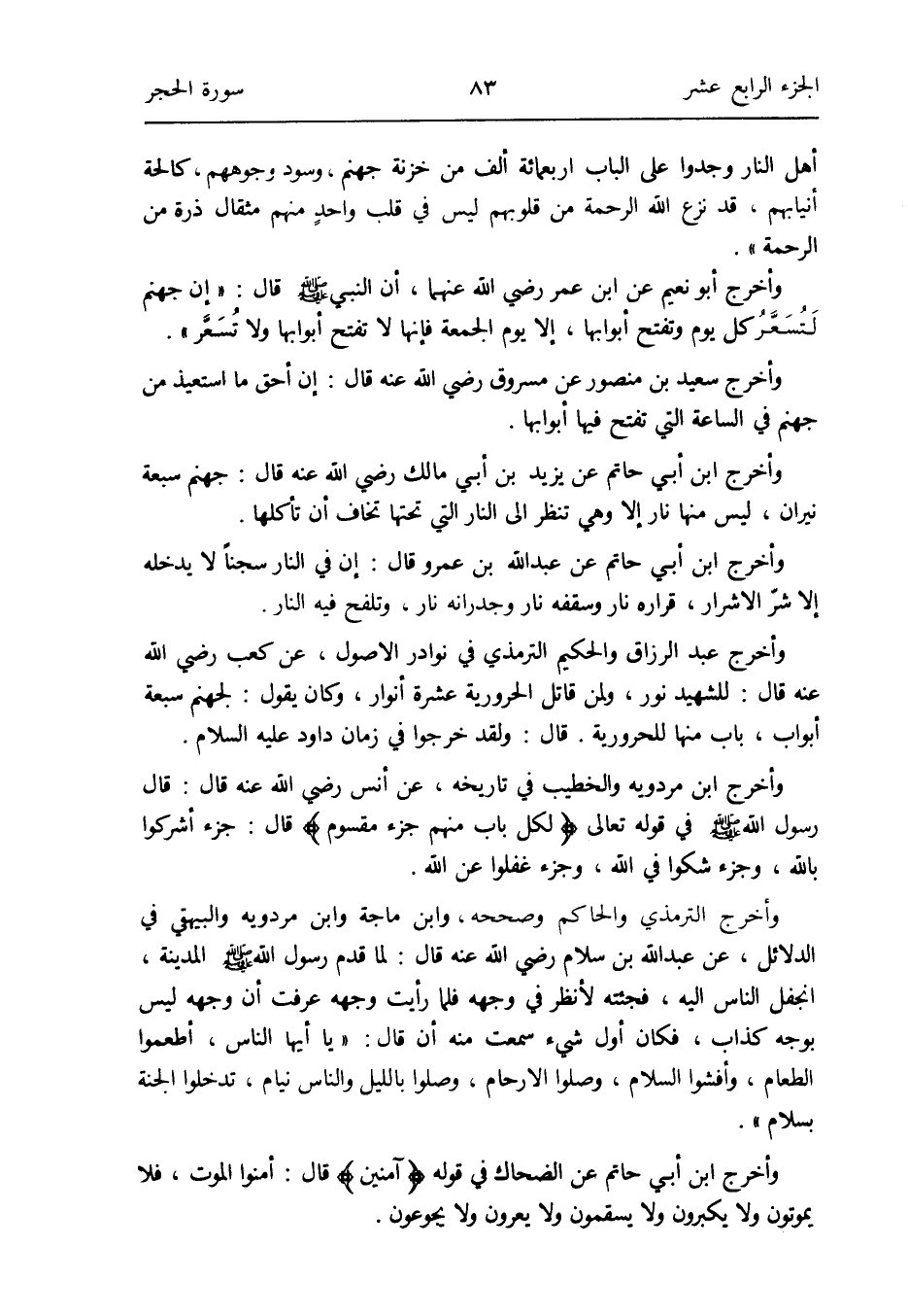 وَأخرج ابْن أبي حَاتِم عَن عبد الله بن عَمْرو قَالَ: إِن فِي النَّار سجناً لَا يدْخلهُ إِلَّا شرّ الأشرار قراره نَار وسقفه نَار وجدرانه نَار وتلفح فِيهِ النَّار