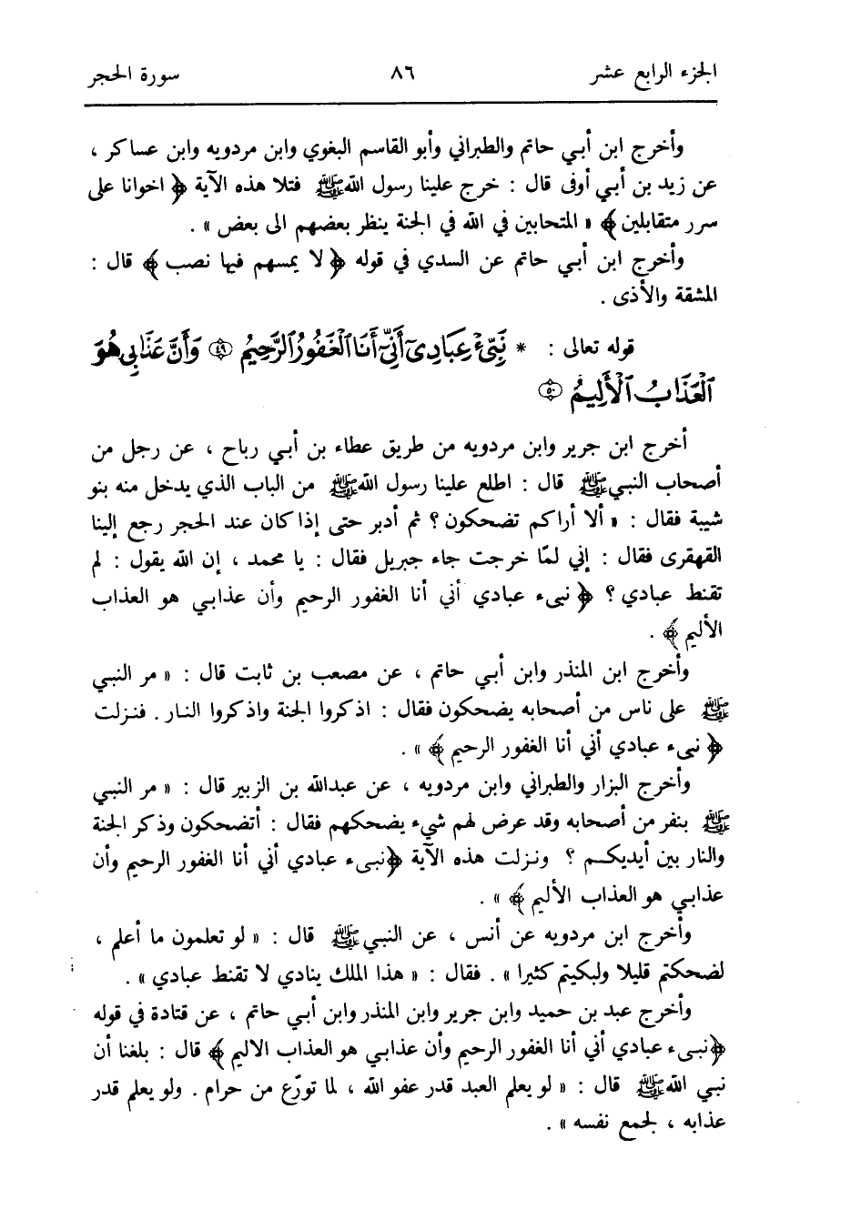 أخرج ابْن جرير وَابْن مرْدَوَيْه من طَرِيق عَطاء بن أبي رَبَاح عَن رجل من أَصْحَاب النَّبِي صلى الله عَلَيْهِ وَسلم قَالَ: اطلع علينا رَسُول الله صلى الله عَلَيْهِ وَسلم من الْبَاب الَّذِي يدْخل مِنْهُ بَنو شيبَة فَقَالَ: أَلا أَرَاكُم تضحكون ثمَّ أدبر حَتَّى إِذا كَانَ الْحجر رَجَعَ إِلَيْنَا الْقَهْقَرَى فَقَالَ: إِنِّي لمّا خرجت جَاءَ جِبْرِيل فَقَالَ: يَا مُحَمَّد إِن الله يَقُول: لم تقنط عبَادي {نبئ عبَادي أَنِّي أَنا الغفور الرَّحِيم وَأَن عَذَابي هُوَ الْعَذَاب الْأَلِيم}