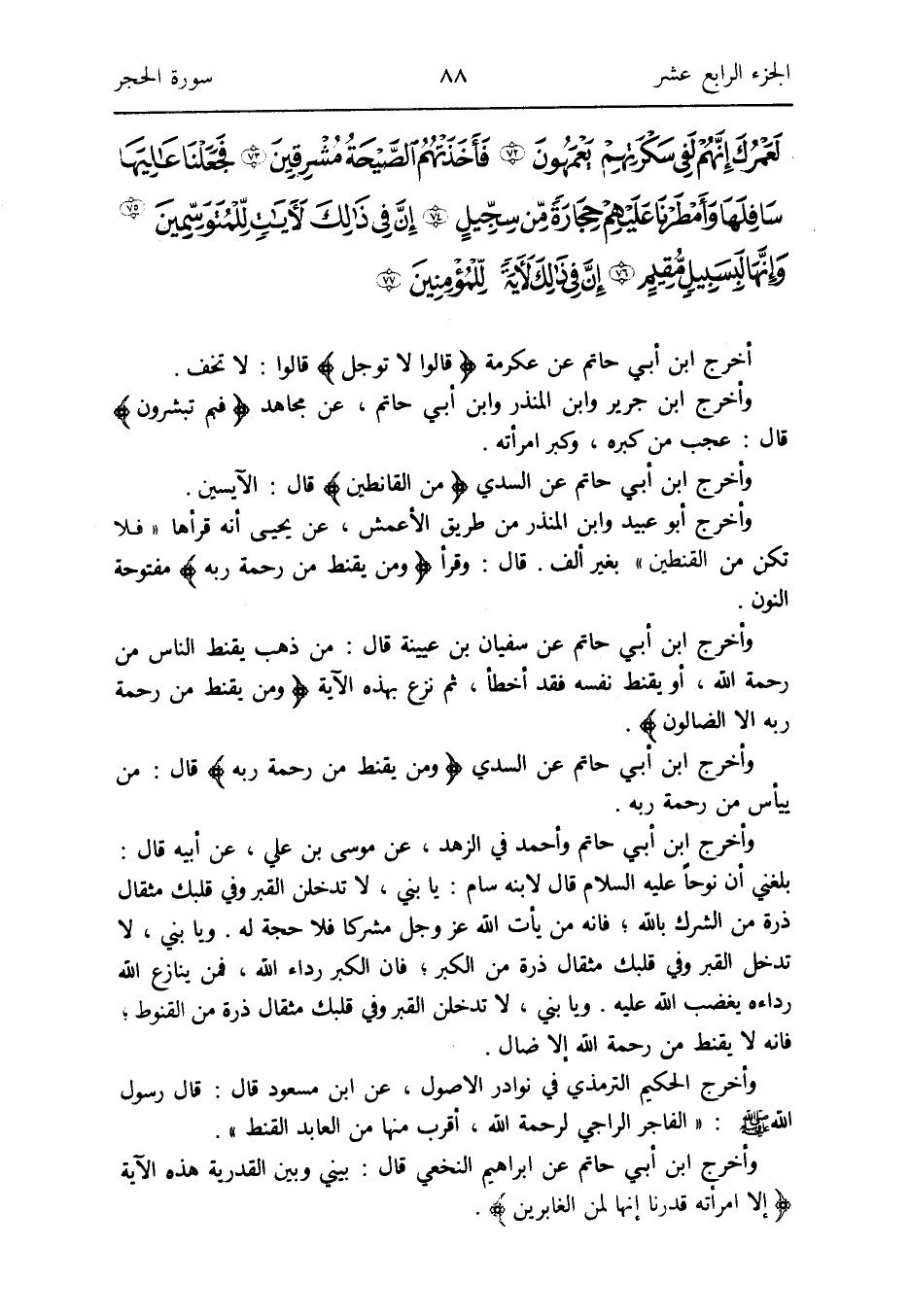 وَأخرج ابْن أبي حَاتِم عَن سُفْيَان بن عُيَيْنَة قَالَ: من ذهب يقنط النَّاس من رَحْمَة الله أَو يقنط نَفسه قفد أَخطَأ ثمَّ نزع بِهَذِهِ الْآيَة {وَمن يقنط من رَحْمَة ربه إِلَّا الضالون}