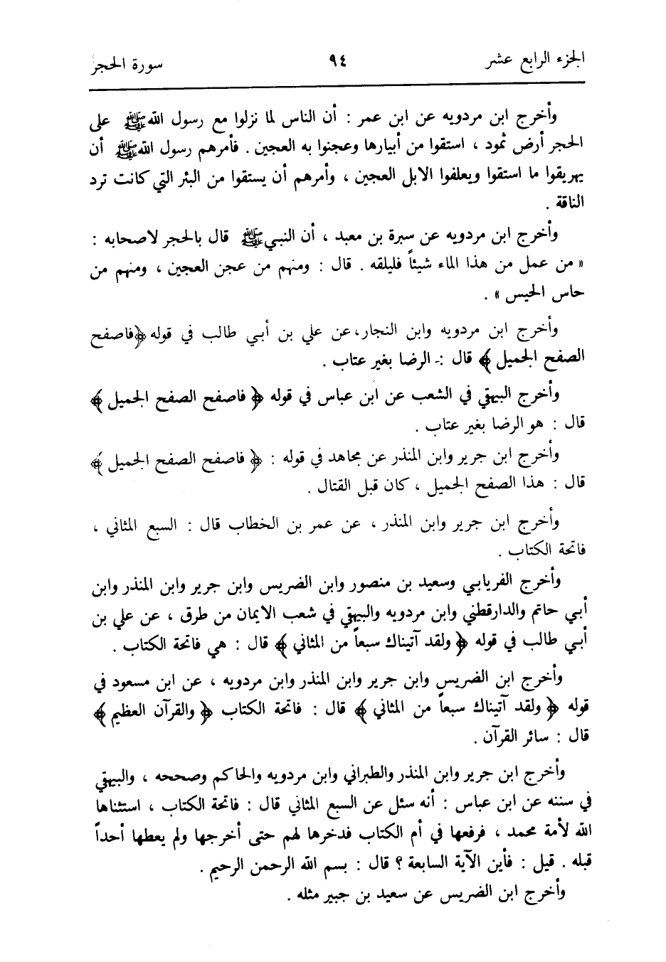 وَأخرج ابْن الضريس وَابْن جرير وَابْن الْمُنْذر وَابْن مرْدَوَيْه عَن ابْن مَسْعُود فِي قَوْله: {وَلَقَد آتيناك سبعا من المثاني} قَالَ: فَاتِحَة الْكتاب {وَالْقُرْآن الْعَظِيم} قَالَ: سَائِر الْقُرْآن