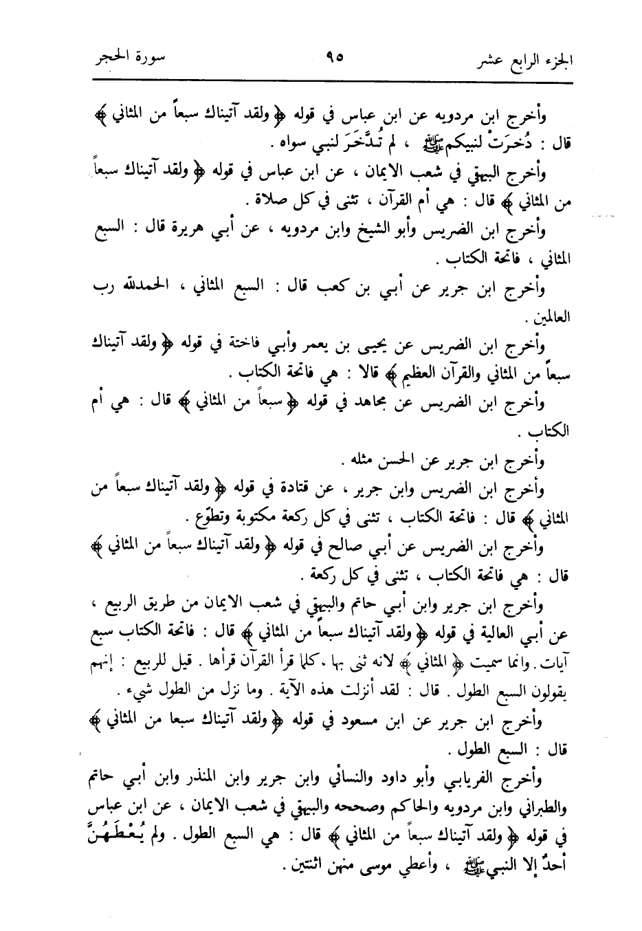 وَأخرج الْبَيْهَقِيّ فِي شعب الإِيمان عَن ابْن عَبَّاس فِي قَوْله: {وَلَقَد آتيناك سبعا من المثاني} قَالَ: هِيَ أم الْقُرْآن تثنى فِي كل صَلَاة