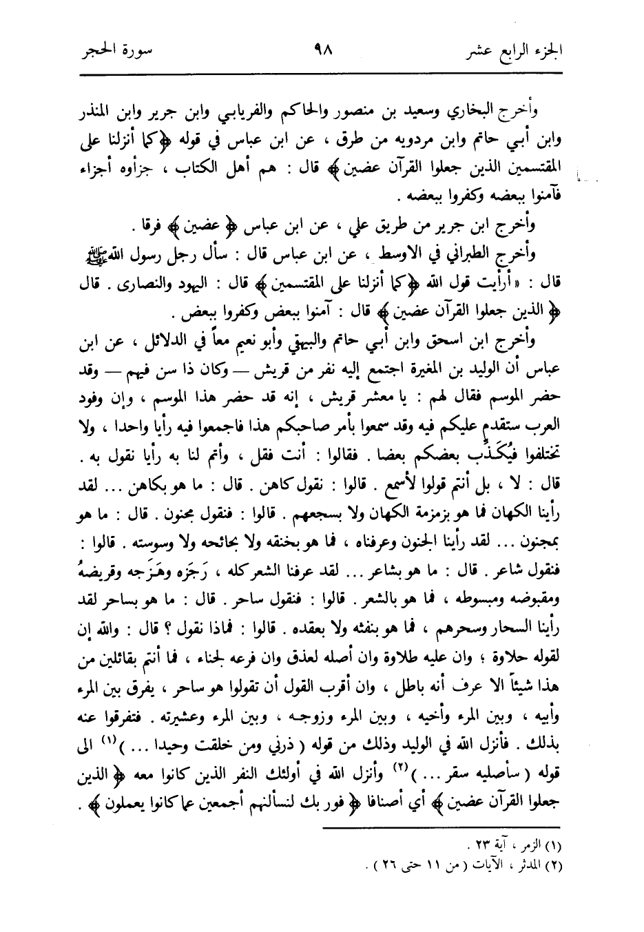 وَأخرج البُخَارِيّ وَسَعِيد بن مَنْصُور وَالْحَاكِم وَالْفِرْيَابِي وَابْن جرير وَابْن الْمُنْذر وَابْن أبي حَاتِم وَابْن مرْدَوَيْه من طرق عَن ابْن عَبَّاس فِي قَوْله: {كَمَا أنزلنَا على المقتسمين الَّذين جعلُوا الْقُرْآن عضين} قَالَ: هم أهل الْكتاب جزأوه أَجزَاء فآمنوا بِبَعْضِه وَكَفرُوا بِبَعْضِه