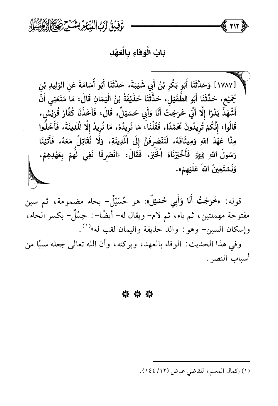 [١٧٨٧] وَحَدَّثَنَا أَبُو بَكْرِ بْنُ أَبِي شَيْبَةَ، حَدَّثَنَا أَبُو أُسَامَةَ عن الوَلِيدِ بْنِ جُمَيْعٍ، حَدَّثَنَا أَبُو الطُّفَيْلِ، حَدَّثَنَا حُذَيْفَةُ بْنُ الْيَمَانِ قَالَ: مَا مَنَعَنِي أَنْ أَشْهَدَ بَدْرًا إِلَّا أَنِّي خَرَجْتُ أَنَا وَأَبِي حُسَيْلٌ، قَالَ: فَأَخَذَنَا كُفَّارُ قُرَيْشٍ، قَالُوا: إِنَّكُمْ تُرِيدُونَ مُحَمَّدًا، فَقُلْنَا: مَا نُرِيدُهُ، مَا نُرِيدُ إِلَّا الْمَدِينَةَ، فَأَخَذُوا مِنَّا عَهْدَ اللَّهِ وَمِيثَاقَهُ، لَنَنْصَرِفَنَّ إِلَى الْمَدِينَةِ، وَلَا نُقَاتِلُ مَعَهُ، فَأَتَيْنَا رَسُولَ اللَّهِ صلى الله عليه وسلم فَأَخْبَرْنَاهُ الْخَبَرَ، فَقَالَ: ((انْصَرِفَا نَفِي لَهُمْ بِعَهْدِهِمْ، وَنَسْتَعِينُ اللَّهَ عَلَيْهِمْ)).