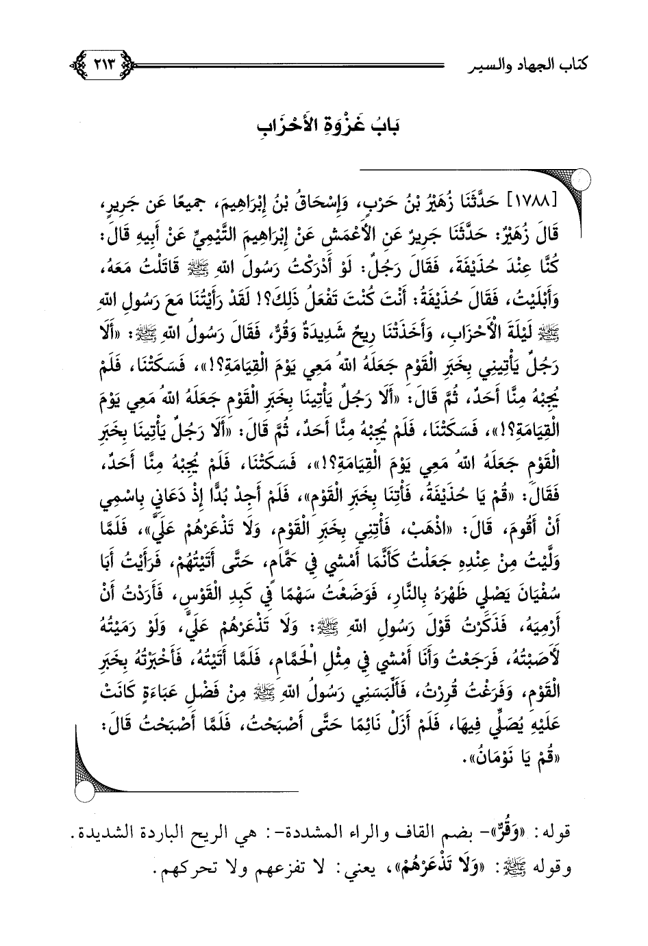 [١٧٨٨] حَدَّثَنَا زُهَيْرُ بْنُ حَرْبٍ، وَإِسْحَاقُ بْنُ إِبْرَاهِيمَ، جميعًا عَن جَرِيرٍ، قَالَ زُهَيْرٌ: حَدَّثَنَا جَرِيرٌ عن الأَعْمَشِ، عَنْ إِبْرَاهِيمَ التَّيْمِيِّ، عَنْ أَبِيهِ قَالَ: كُنَّا عِنْدَ حُذَيْفَةَ، فَقَالَ رَجُلٌ: لَوْ أَدْرَكْتُ رَسُولَ اللَّهِ صلى الله عليه وسلم قَاتَلْتُ مَعَهُ، وَأَبْلَيْتُ، فَقَالَ حُذَيْفَةُ: أَنْتَ كُنْتَ تَفْعَلُ ذَلِكَ؟ ! لَقَدْ رَأَيْتُنَا مَعَ رَسُولِ اللَّهِ صلى الله عليه وسلم لَيْلَةَ الْأَحْزَابِ، وَأَخَذَتْنَا رِيحٌ شَدِيدَةٌ وَقُرٌّ، فَقَالَ رَسُولُ اللَّهِ صلى الله عليه وسلم: ((أَلَا رَجُلٌ يَأْتِينِي بِخَبَرِ الْقَوْمِ جَعَلَهُ اللَّهُ مَعِي يَوْمَ الْقِيَامَةِ؟ ! ))، فَسَكَتْنَا، فَلَمْ يُجِبْهُ مِنَّا أَحَدٌ، ثُمَّ قَالَ: ((أَلَا رَجُلٌ يَأْتِينَا بِخَبَرِ الْقَوْمِ جَعَلَهُ اللَّهُ مَعِي يَوْمَ الْقِيَامَةِ؟ ! ))، فَسَكَتْنَا، فَلَمْ يُجِبْهُ مِنَّا أَحَدٌ، ثُمَّ قَالَ: ((أَلَا رَجُلٌ يَأْتِينَا بِخَبَرِ الْقَوْمِ جَعَلَهُ اللَّهُ مَعِي يَوْمَ الْقِيَامَةِ؟ ! ))، فَسَكَتْنَا، فَلَمْ يُجِبْهُ مِنَّا أَحَدٌ، فَقَالَ: ((قُمْ يَا حُذَيْفَةُ، فَأْتِنَا بِخَبَرِ الْقَوْمِ))، فَلَمْ أَجِدْ بُدًّا إِذْ دَعَانِي بِاسْمِي أَنْ أَقُومَ، قَالَ: ((اذْهَبْ، فَأْتِنِي بِخَبَرِ الْقَوْمِ، وَلَا تَذْعَرْهُمْ عَلَيَّ))، فَلَمَّا وَلَّيْتُ مِنْ عِنْدِهِ جَعَلْتُ كَأَنَّمَا أَمْشِي فِي حَمَّامٍ، حَتَّى أَتَيْتُهُمْ، فَرَأَيْتُ أَبَا سُفْيَانَ يَصْلِي ظَهْرَهُ بِالنَّارِ، فَوَضَعْتُ سَهْمًا فِي كَبِدِ الْقَوْسِ، فَأَرَدْتُ أَنْ أَرْمِيَهُ، فَذَكَرْتُ قَوْلَ رَسُولِ اللَّهِ صلى الله عليه وسلم: وَلَا تَذْعَرْهُمْ عَلَيَّ، وَلَوْ رَمَيْتُهُ لَأَصَبْتُهُ، فَرَجَعْتُ وَأَنَا أَمْشِي فِي مِثْلِ الْحَمَّامِ، فَلَمَّا أَتَيْتُهُ، فَأَخْبَرْتُهُ