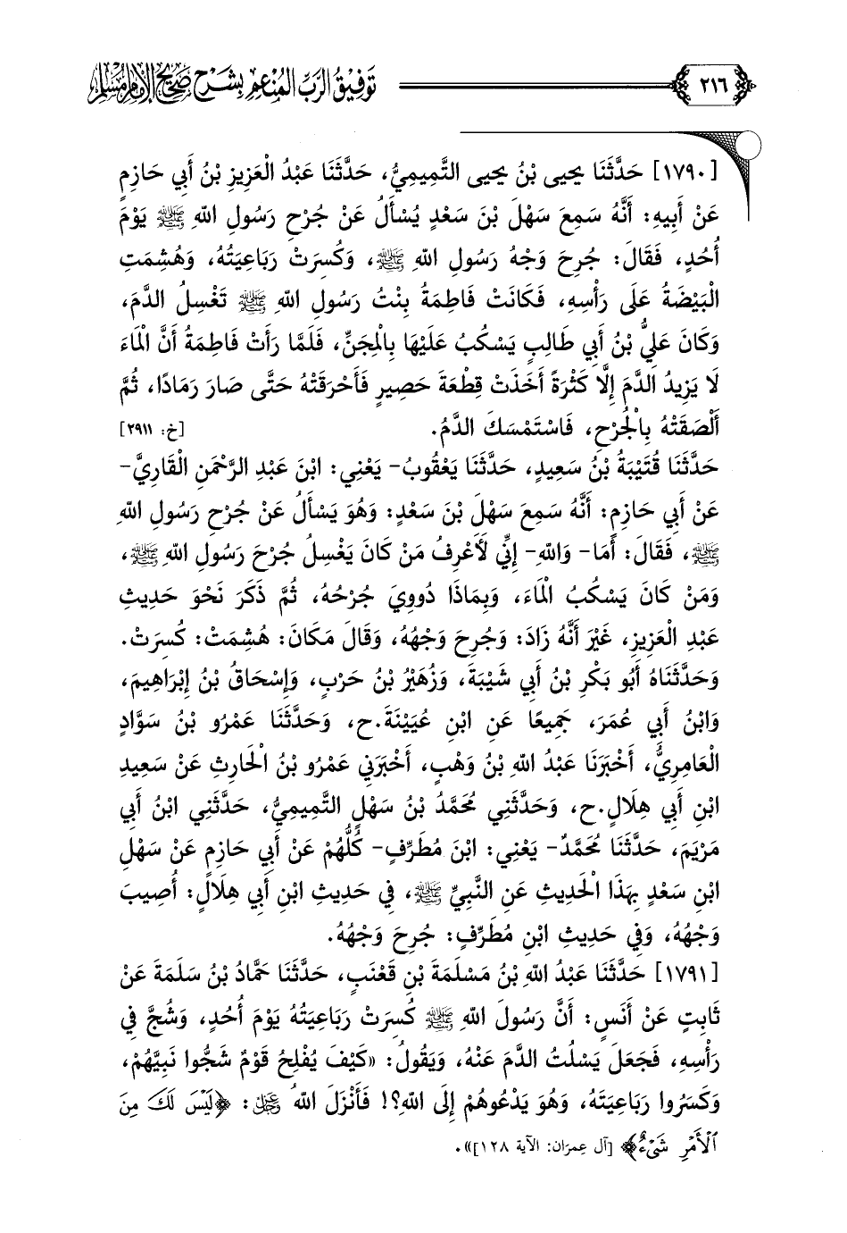 [١٧٩١] حَدَّثَنَا عَبْدُ اللَّهِ بْنُ مَسْلَمَةَ بْنِ قَعْنَبٍ، حَدَّثَنَا حَمَّادُ بْنُ سَلَمَةَ عَنْ ثَابِتٍ عَنْ أَنَسٍ: أَنَّ رَسُولَ اللَّهِ صلى الله عليه وسلم كُسِرَتْ رَبَاعِيَتُهُ يَوْمَ أُحُدٍ، وَشُجَّ فِي رَأْسِهِ، فَجَعَلَ يَسْلُتُ الدَّمَ عَنْهُ، وَيَقُولُ: ((كَيْفَ يُفْلِحُ قَوْمٌ شَجُّوا نَبِيَّهُمْ، وَكَسَرُوا رَبَاعِيَتَهُ، وَهُوَ يَدْعُوهُمْ إِلَى اللَّهِ؟ ! فَأَنْزَلَ اللَّهُ عز وجل: {لَيْسَ لَكَ مِنَ الأَمْرِ شَيْءٌ})).