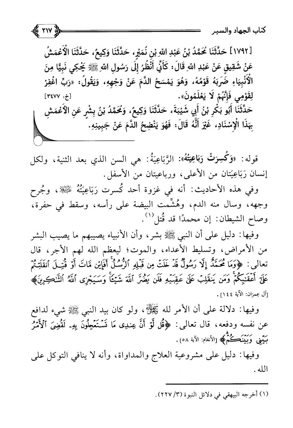 حَدَّثَنَا أَبُو بَكْرِ بْنُ أَبِي شَيْبَةَ، حَدَّثَنَا وَكِيعٌ، وَمُحَمَّدُ بْنُ بِشْرٍ عن الأَعْمَشِ بِهَذَا الْإِسْنَادِ، غَيْرَ أَنَّهُ قَالَ: فَهُوَ يَنْضِحُ الدَّمَ عَنْ جَبِينِهِ.