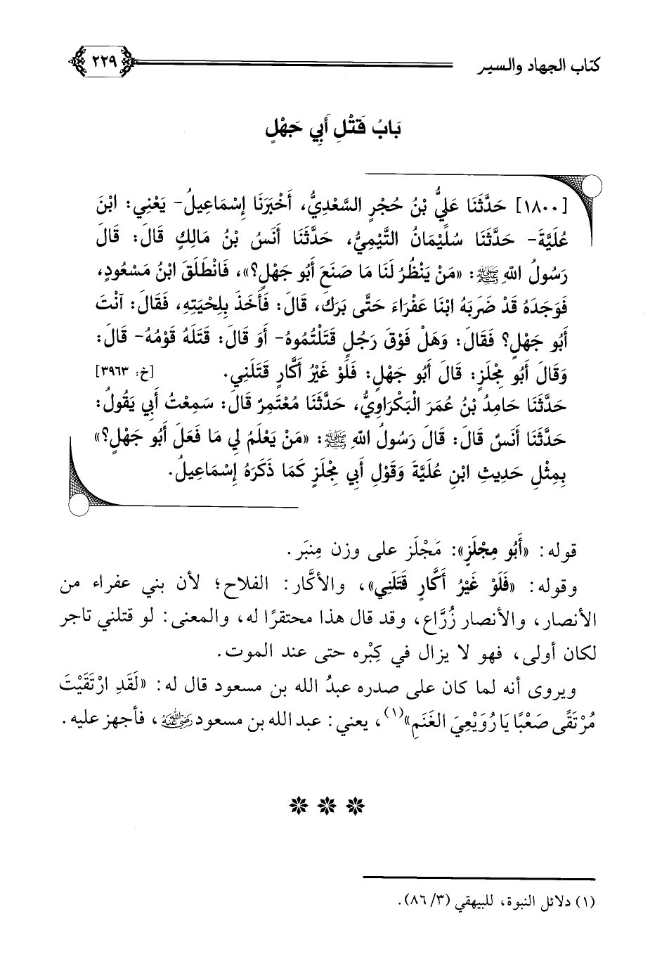 [١٨٠٠] حَدَّثَنَا عَلِيُّ بْنُ حُجْرٍ السَّعْدِيُّ، أَخْبَرَنَا إِسْمَاعِيلُ- يَعْنِي: ابْنَ عُلَيَّةَ- حَدَّثَنَا سُلَيْمَانُ التَّيْمِيُّ، حَدَّثَنَا أَنَسُ بْنُ مَالِكٍ قَالَ: قَالَ رَسُولُ اللَّهِ صلى الله عليه وسلم: ((مَنْ يَنْظُرُ لَنَا مَا صَنَعَ أَبُو جَهْلٍ؟ ))، فَانْطَلَقَ ابْنُ مَسْعُودٍ، فَوَجَدَهُ قَدْ ضَرَبَهُ ابْنَا عَفْرَاءَ حَتَّى بَرَكَ، قَالَ: فَأَخَذَ بِلِحْيَتِهِ، فَقَالَ: آنْتَ أَبُو جَهْلٍ؟ فَقَالَ: وَهَلْ فَوْقَ رَجُلٍ قَتَلْتُمُوهُ- أَوَ قَالَ: قَتَلَهُ قَوْمُهُ- قَالَ: وَقَالَ أَبُو مِجْلَزٍ: قَالَ أَبُو جَهْلٍ: فَلَوْ غَيْرُ أَكَّارٍ قَتَلَنِي.