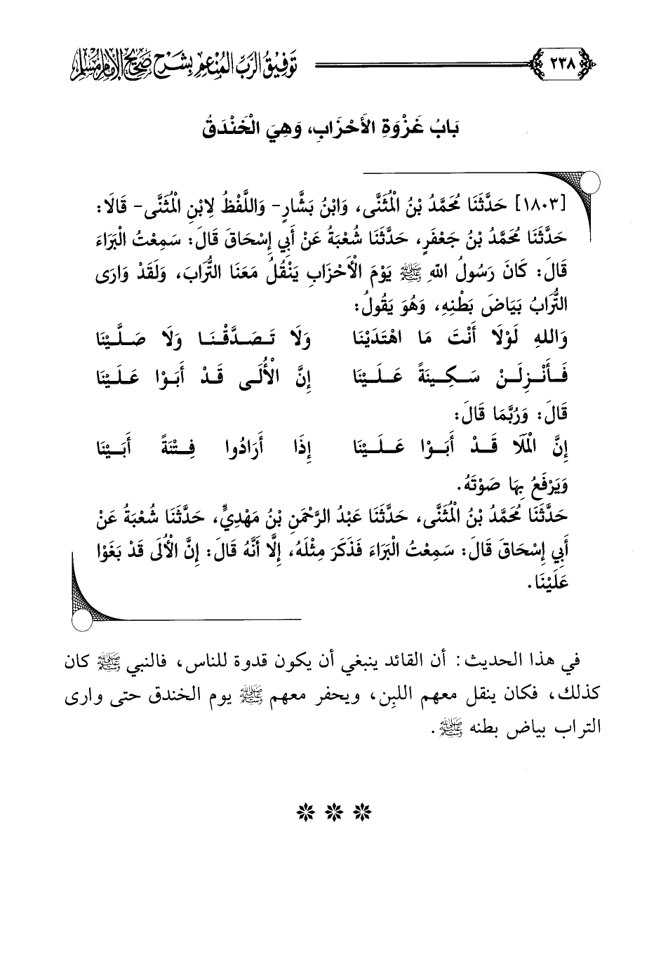 [١٨٠٣] حَدَّثَنَا مُحَمَّدُ بْنُ الْمُثَنَّى، وَابْنُ بَشَّارٍ- وَاللَّفْظُ لِابْنِ الْمُثَنَّى- قَالَا: حَدَّثَنَا مُحَمَّدُ بْنُ جَعْفَرٍ، حَدَّثَنَا شُعْبَةُ عَنْ أَبِي إِسْحَاقَ قَالَ: سَمِعْتُ الْبَرَاءَ قَالَ: كَانَ رَسُولُ اللَّهِ صلى الله عليه وسلم يَوْمَ الْأَحْزَابِ يَنْقُلُ مَعَنَا التُّرَابَ، وَلَقَدْ وَارَى التُّرَابُ بَيَاضَ بَطْنِهِ، وَهُوَ يَقُولُ: