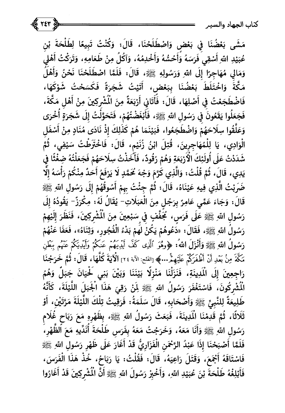 الْآيَةَ كُلَّهَا، قَالَ: ثُمَّ خَرَجْنَا رَاجِعِينَ إِلَى الْمَدِينَةِ، فَنَزَلْنَا مَنْزِلًا بَيْنَنَا وَبَيْنَ بَنِي لَحْيَانَ جَبَلٌ وَهُمُ الْمُشْرِكُونَ، فَاسْتَغْفَرَ رَسُولُ اللَّهِ صلى الله عليه وسلم لِمَنْ رَقِيَ هَذَا الْجَبَلَ اللَّيْلَةَ، كَأَنَّهُ طَلِيعَةٌ لِلنَّبِيِّ صلى الله عليه وسلم وَأَصْحَابِهِ، قَالَ سَلَمَةُ: فَرَقِيتُ تِلْكَ اللَّيْلَةَ مَرَّتَيْنِ، أَوْ ثَلَاثًا، ثُمَّ قَدِمْنَا الْمَدِينَةَ، فَبَعَثَ رَسُولُ اللَّهِ صلى الله عليه وسلم، بِظَهْرِهِ مَعَ رَبَاحٍ غُلَامِ رَسُولِ اللَّهِ صلى الله عليه وسلم وَأَنَا مَعَهُ، وَخَرَجْتُ مَعَهُ بِفَرَسِ طَلْحَةَ أُنَدِّيهِ مَعَ الظَّهْرِ، فَلَمَّا أَصْبَحْنَا إِذَا عَبْدُ الرَّحْمَنِ الْفَزَارِيُّ قَدْ أَغَارَ عَلَى ظَهْرِ رَسُولِ اللَّهِ صلى الله عليه وسلم فَاسْتَاقَهُ أَجْمَعَ، وَقَتَلَ رَاعِيَهُ، قَالَ: فَقُلْتُ: يَا رَبَاحُ، خُذْ هَذَا الْفَرَسَ، فَأَبْلِغْهُ طَلْحَةَ بْنَ عُبَيْدِ اللَّهِ، وَأَخْبِرْ رَسُولَ اللَّهِ صلى الله عليه وسلم أَنَّ الْمُشْرِكِينَ قَدْ أَغَارُوا