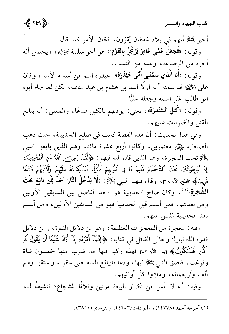 وهذا الحديث فيه: أن هذه القصة كانت في صلح الحديبية، حيث ذهب الصحابة رضي الله عنهم معتمرين، وكانوا أربع عشرة مائة، وهم الذين بايعوا النبي صلى الله عليه وسلم تحت الشجرة، وهم الذين قال الله فيهم: {لَّقَدْ رَضِيَ اللَّهُ عَنِ الْمُؤْمِنِينَ إِذْ يُبَايِعُونَكَ تَحْتَ الشَّجَرَةِ فَعَلِمَ مَا فِي قُلُوبِهِمْ فَأَنزَلَ السَّكِينَةَ عَلَيْهِمْ وَأَثَابَهُمْ فَتْحًا قَرِيبًا}، وقال فيهم النبي صلى الله عليه وسلم: ((لَا يَدْخُلُ النَّارَ أَحَدٌ مِمَّنْ بَايَعَ تَحْتَ الشَّجَرَةِ)) (¬١)، وكان صلح الحديبية الحد الفاصل بين السابقين الأولين ومن بعدهم، فمن أسلم قبل الحديبية فهو من السابقين الأولين، ومن أسلم بعد الحديبية فليس منهم.
