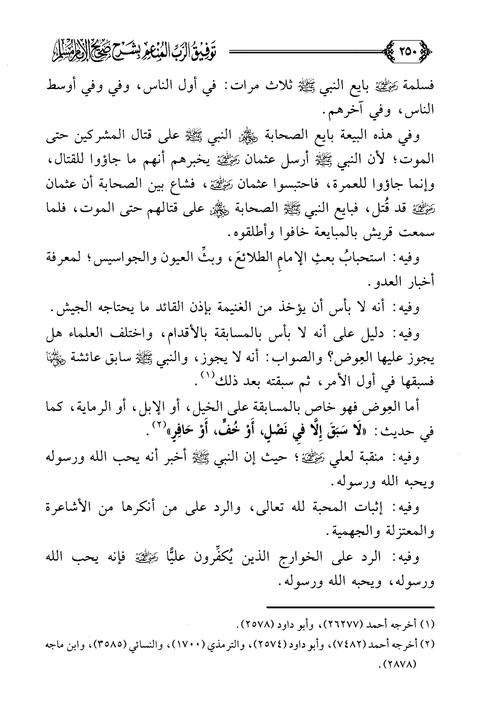 وفيه: دليل على أنه لا بأس بالمسابقة بالأقدام، واختلف العلماء هل يجوز عليها العِوض؟ والصواب: أنه لا يجوز، والنبي صلى الله عليه وسلم سابق عائشة رضي الله عنها فسبقها في أول الأمر، ثم سبقته بعد ذلك (¬١).