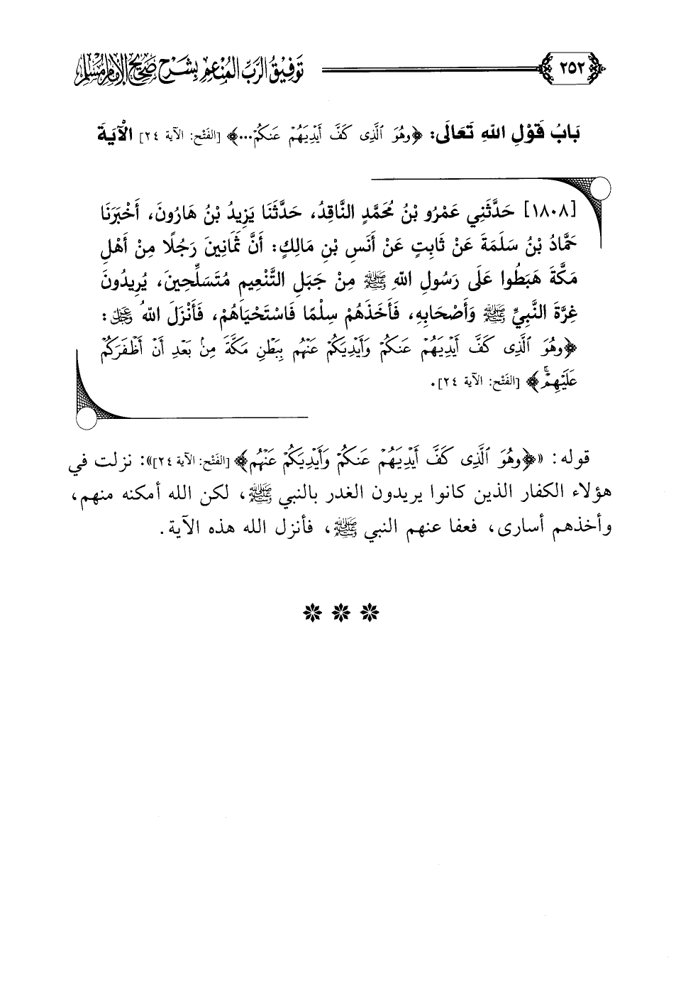 [١٨٠٨] حَدَّثَنِي عَمْرُو بْنُ مُحَمَّدٍ النَّاقِدُ، حَدَّثَنَا يَزِيدُ بْنُ هَارُونَ، أَخْبَرَنَا حَمَّادُ بْنُ سَلَمَةَ عَنْ ثَابِتٍ، عَنْ أَنَسِ بْنِ مَالِكٍ: أَنَّ ثَمَانِينَ رَجُلًا مِنْ أَهْلِ مَكَّةَ هَبَطُوا عَلَى رَسُولِ اللَّهِ صلى الله عليه وسلم مِنْ جَبَلِ التَّنْعِيمِ مُتَسَلِّحِينَ، يُرِيدُونَ غِرَّةَ النَّبِيِّ صلى الله عليه وسلم وَأَصْحَابِهِ، فَأَخَذَهُمْ سِلْمًا فَاسْتَحْيَاهُمْ، فَأَنْزَلَ اللَّهُ عز وجل: {وَهُوَ الَّذِي كَفَّ أَيْدِيَهُمْ عَنْكُمْ وَأَيْدِيَكُمْ عَنْهُمْ بِبَطْنِ مَكَّةَ مِنْ بَعْدِ أَنْ أَظْفَرَكُمْ عَلَيْهِمْ}.