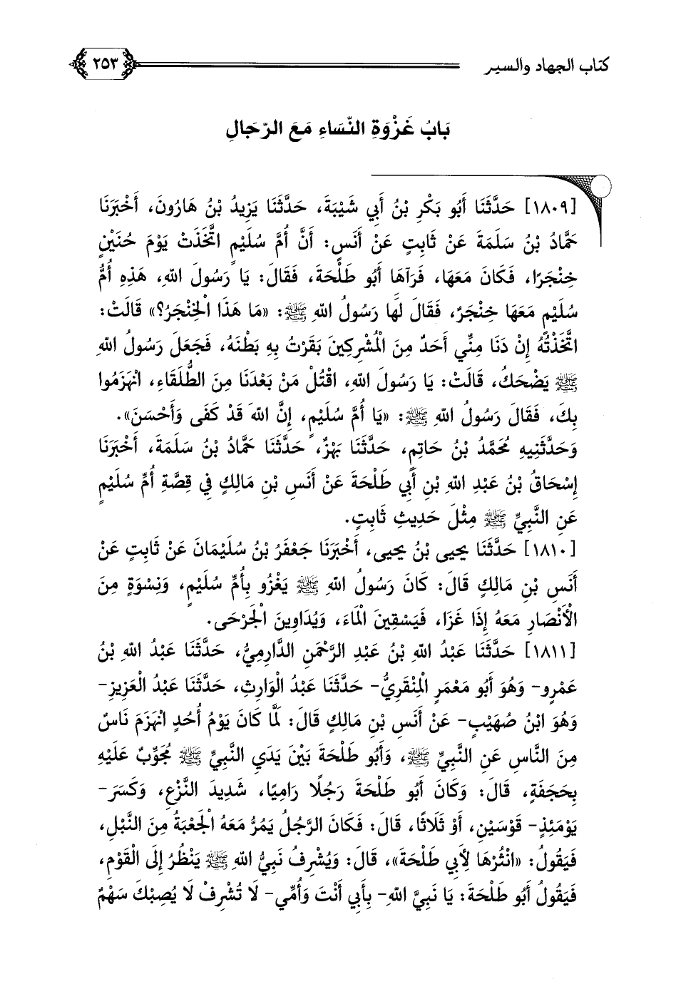 [١٨٠٩] حَدَّثَنَا أَبُو بَكْرِ بْنُ أَبِي شَيْبَةَ، حَدَّثَنَا يَزِيدُ بْنُ هَارُونَ، أَخْبَرَنَا حَمَّادُ ابْنُ سَلَمَةَ عَنْ ثَابِتٍ، عَنْ أَنَسٍ: أَنَّ أُمَّ سُلَيْمٍ اتَّخَذَتْ يَوْمَ حُنَيْنٍ خِنْجَرًا، فَكَانَ مَعَهَا، فَرَأَىهَا أَبُو طَلْحَةَ، فَقَالَ: يَا رَسُولَ اللَّهِ، هَذِهِ أُمُّ سُلَيْمٍ مَعَهَا خِنْجَرٌ، فَقَالَ لَهَا رَسُولُ اللَّهِ صلى الله عليه وسلم: ((مَا هَذَا الْخِنْجَرُ؟ )) قَالَتْ: اتَّخَذْتُهُ إِنْ دَنَا مِنِّي أَحَدٌ مِنَ الْمُشْرِكِينَ بَقَرْتُ بِهِ بَطْنَهُ، فَجَعَلَ رَسُولُ اللَّهِ صلى الله عليه وسلم يَضْحَكُ، قَالَتْ: يَا رَسُولَ اللَّهِ، اقْتُلْ مَنْ بَعْدَنَا مِنَ الطُّلَقَاءِ، انْهَزَمُوا بِكَ، فَقَالَ رَسُولُ اللَّهِ صلى الله عليه وسلم: ((يَا أُمَّ سُلَيْمٍ إِنَّ اللَّهَ قَدْ كَفَى وَأَحْسَنَ)).