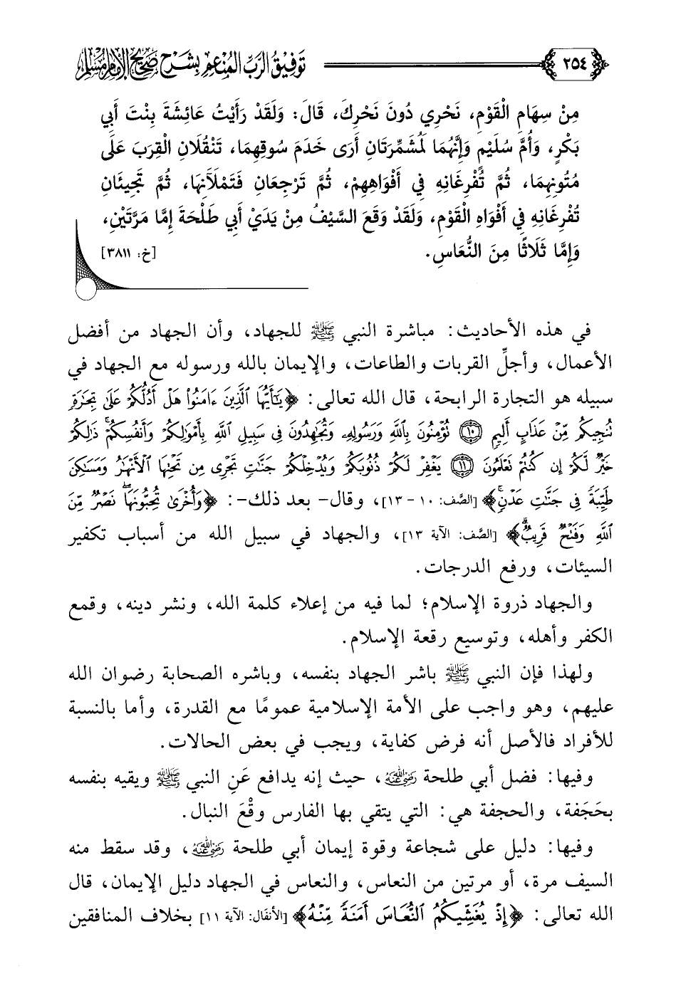 مِنْ سِهَامِ الْقَوْمِ، نَحْرِي دُونَ نَحْرِكَ، قَالَ: وَلَقَدْ رَأَيْتُ عَائِشَةَ بِنْتَ أَبِي بَكْرٍ، وَأُمَّ سُلَيْمٍ وَإِنَّهُمَا لَمُشَمِّرَتَانِ أَرَى خَدَمَ سُوقِهِمَا، تَنْقُلَانِ الْقِرَبَ عَلَى مُتُونِهِمَا، ثُمَّ تُفْرِغَانِهِ فِي أَفْوَاهِهِمْ، ثُمَّ تَرْجِعَانِ فَتَمْلَآَنِهَا، ثُمَّ تَجِيئَانِ تُفْرِغَانِهِ فِي أَفْوَاهِ الْقَوْمِ، وَلَقَدْ وَقَعَ السَّيْفُ مِنْ يَدَيْ أَبِي طَلْحَةَ إِمَّا مَرَّتَيْنِ، وَإِمَّا ثَلَاثًا مِنَ النُّعَاسِ.