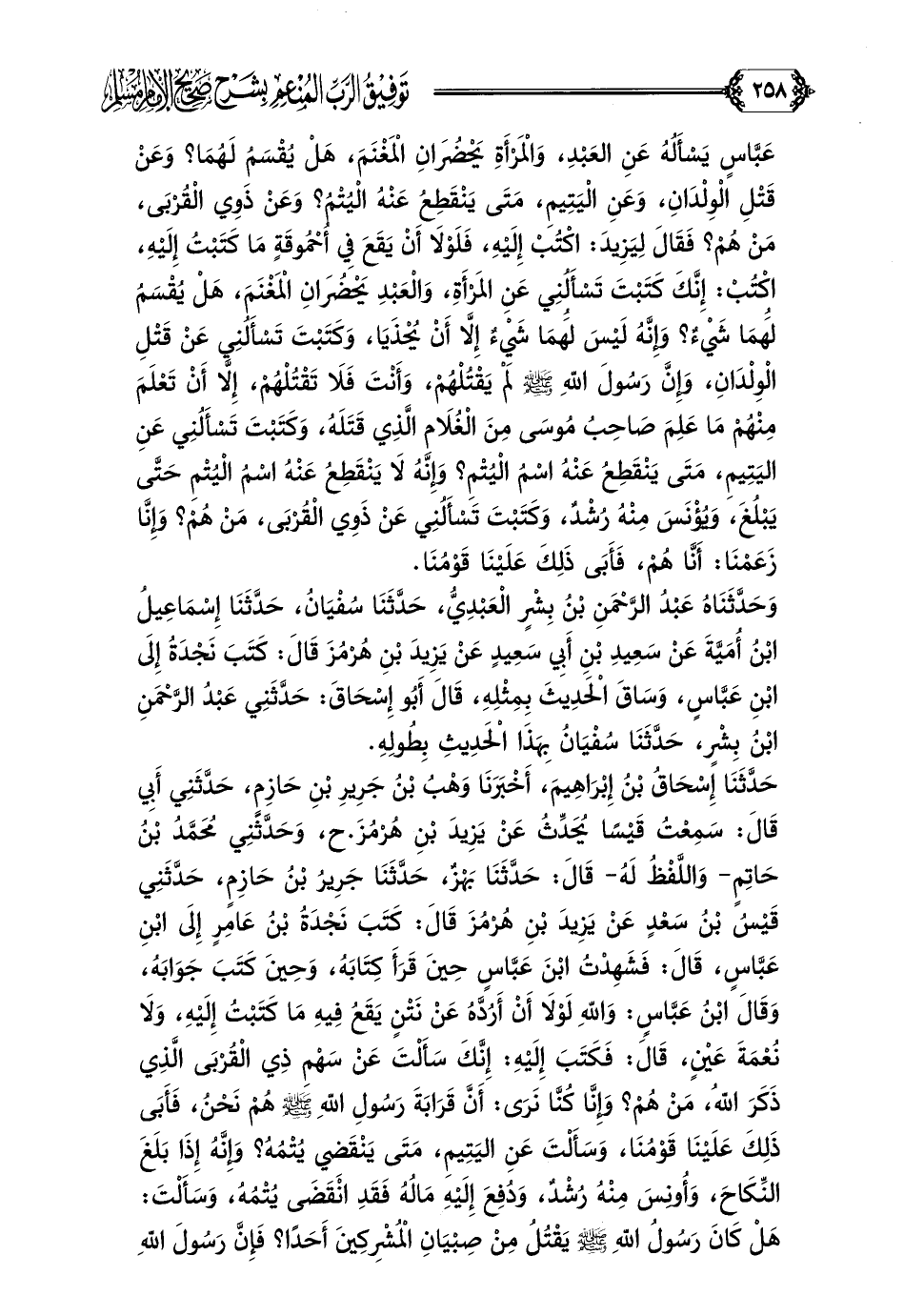 حَدَّثَنَا إِسْحَاقُ بْنُ إِبْرَاهِيمَ، أَخْبَرَنَا وَهْبُ بْنُ جَرِيرِ بْنِ حَازِمٍ، حَدَّثَنِي أَبِي قَالَ: سَمِعْتُ قَيْسًا يُحَدِّثُ عَنْ يَزِيدَ بْنِ هُرْمُزَ. ح، وَحَدَّثَنِي مُحَمَّدُ بْنُ حَاتِمٍ- وَاللَّفْظُ لَهُ- قَالَ: حَدَّثَنَا بَهْزٌ، حَدَّثَنَا جَرِيرُ بْنُ حَازِمٍ، حَدَّثَنِي قَيْسُ بْنُ سَعْدٍ عَنْ يَزِيدَ بْنِ هُرْمُزَ قَالَ: كَتَبَ نَجْدَةُ بْنُ عَامِرٍ إِلَى ابْنِ عَبَّاسٍ، قَالَ: فَشَهِدْتُ ابْنَ عَبَّاسٍ حِينَ قَرَأَ كِتَابَهُ، وَحِينَ كَتَبَ جَوَابَهُ، وَقَالَ ابْنُ عَبَّاسٍ: وَاللَّهِ لَوْلَا أَنْ أَرُدَّهُ عَنْ نَتْنٍ يَقَعُ فِيهِ مَا كَتَبْتُ إِلَيْهِ، وَلَا نُعْمَةَ عَيْنٍ، قَالَ: فَكَتَبَ إِلَيْهِ: إِنَّكَ سَأَلْتَ عَنْ سَهْمِ ذِي الْقُرْبَى الَّذِي ذَكَرَ اللَّهُ، مَنْ هُمْ؟ وَإِنَّا كُنَّا نَرَى: أَنَّ قَرَابَةَ رَسُولِ اللَّهِ صلى الله عليه وسلم هُمْ نَحْنُ، فَأَبَى ذَلِكَ عَلَيْنَا قَوْمُنَا، وَسَأَلْتَ عَنِ الْيَتِيمِ، مَتَى يَنْقَضِي يُتْمُهُ؟ وَإِنَّهُ إِذَا بَلَغَ النِّكَاحَ، وَأُونِسَ مِنْهُ رُشْدٌ، وَدُفِعَ إِلَيْهِ مَالُهُ فَقَدِ انْقَضَى يُتْمُهُ، وَسَأَلْتَ: هَلْ كَانَ رَسُولُ اللَّهِ صلى الله عليه وسلم يَقْتُلُ مِنْ صِبْيَانِ الْمُشْرِكِينَ أَحَدًا؟ فَإِنَّ رَسُولَ اللَّهِ