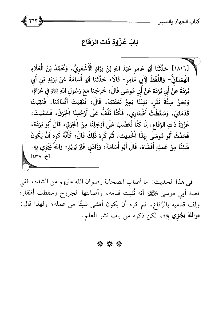 قوله: ((فَكُنَّا نَلُفُّ عَلَى أَرْجُلِنَا الْخِرَقَ، فَسُمِّيَتْ: غَزْوَةَ ذَاتِ الرِّقَاعِ)) المقصود من تسمية ذات الرقاع، فقد اختلفوا في تسميتها، فأبو موسى رضي الله عنه رأى أنها سميت ذات الرقاع؛ لأنهم كانو ايعصبون على أرجلهم الخرق، وقيل: إنها سميت بذلك لاسم الجبل، وقيل: للسببين معًا.] [*]