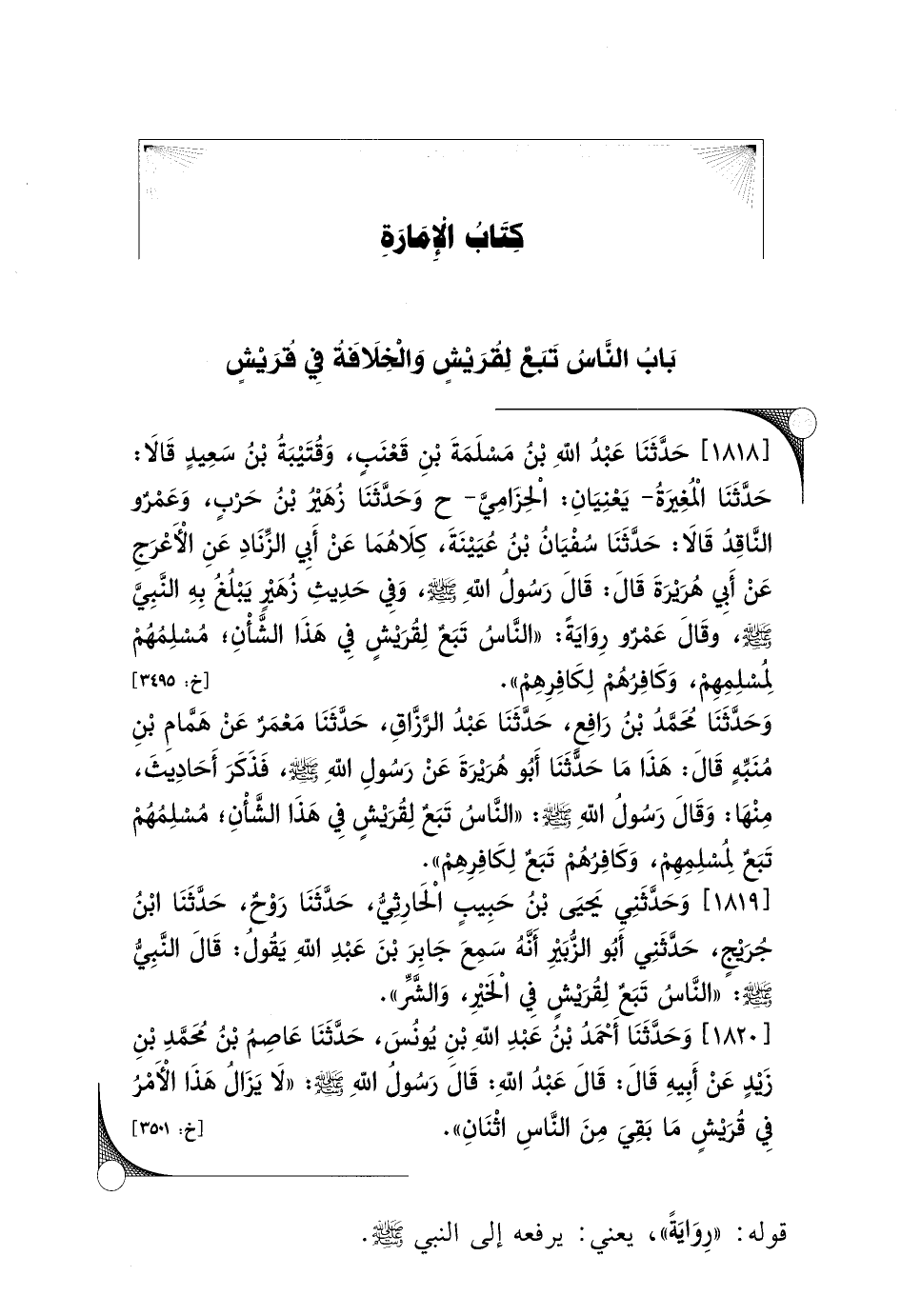 [١٨١٨] حَدَّثَنَا عَبْدُ اللهِ بْنُ مَسْلَمَةَ بْنِ قَعْنَبٍ، وَقُتَيْبَةُ بْنُ سَعِيدٍ قَالَا: حَدَّثَنَا الْمُغِيرَةُ- يَعْنِيَانِ: الْحِزَامِيَّ- ح وَحَدَّثَنَا زُهَيْرُ بْنُ حَرْبٍ، وَعَمْرٌو النَّاقِدُ قَالَا: حَدَّثَنَا سُفْيَانُ بْنُ عُيَيْنَةَ، كِلَاهُمَا عَنْ أَبِي الزِّنَادِ عَنِ الْأَعْرَجِ عَنْ أَبِي هُرَيْرَةَ قَالَ: قَالَ رَسُولُ اللهِ صلى الله عليه وسلم، وَفِي حَدِيثِ زُهَيْرٍ يَبْلُغُ بِهِ النَّبِيَّ صلى الله عليه وسلم، وقَالَ عَمْرٌو رِوَايَةً: ((النَّاسُ تَبَعٌ لِقُرَيْشٍ فِي هَذَا الشَّأْنِ؛ مُسْلِمُهُمْ لِمُسْلِمِهِمْ، وَكَافِرُهُمْ لِكَافِرِهِمْ)).