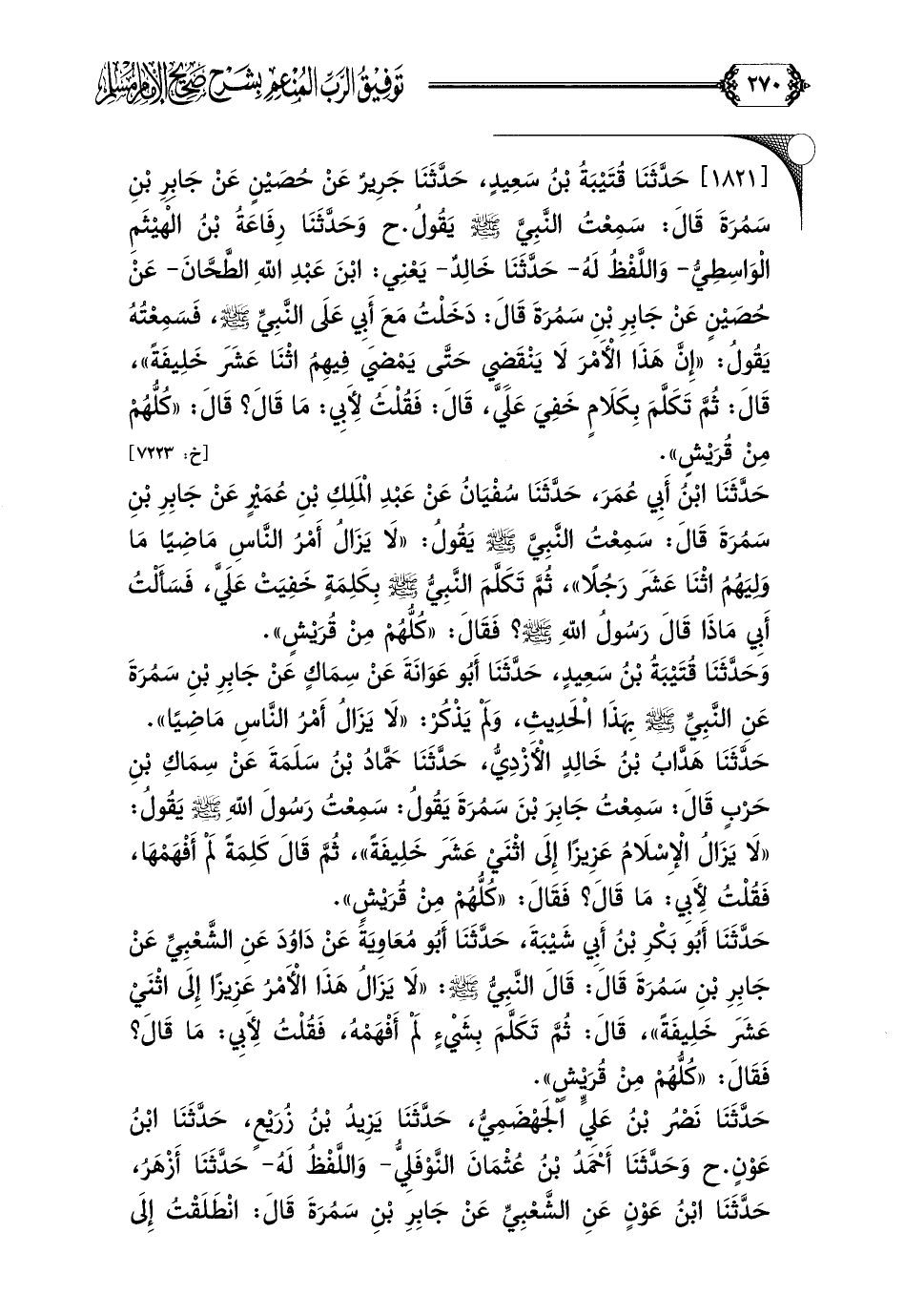 [١٨٢١] حَدَّثَنَا قُتَيْبَةُ بْنُ سَعِيدٍ، حَدَّثَنَا جَرِيرٌ عَنْ حُصَيْنٍ عَنْ جَابِرِ بْنِ سَمُرَةَ قَالَ: سَمِعْتُ النَّبِيَّ صلى الله عليه وسلم يَقُولُ. ح وَحَدَّثَنَا رِفَاعَةُ بْنُ الْهَيْثَمِ الْوَاسِطِيُّ- وَاللَّفْظُ لَهُ- حَدَّثَنَا خَالِدٌ- يَعْنِي: ابْنَ عَبْدِ اللهِ الطَّحَّانَ- عَنْ حُصَيْنٍ عَنْ جَابِرِ بْنِ سَمُرَةَ قَالَ: دَخَلْتُ مَعَ أَبِي عَلَى النَّبِيِّ صلى الله عليه وسلم، فَسَمِعْتُهُ يَقُولُ: ((إِنَّ هَذَا الْأَمْرَ لَا يَنْقَضِي حَتَّى يَمْضِيَ فِيهِمُ اثْنَا عَشَرَ خَلِيفَةً))، قَالَ: ثُمَّ تَكَلَّمَ بِكَلَامٍ خَفِيَ عَلَيَّ، قَالَ: فَقُلْتُ لِأَبِي: مَا قَالَ؟ قَالَ: ((كُلُّهُمْ مِنْ قُرَيْشٍ)).