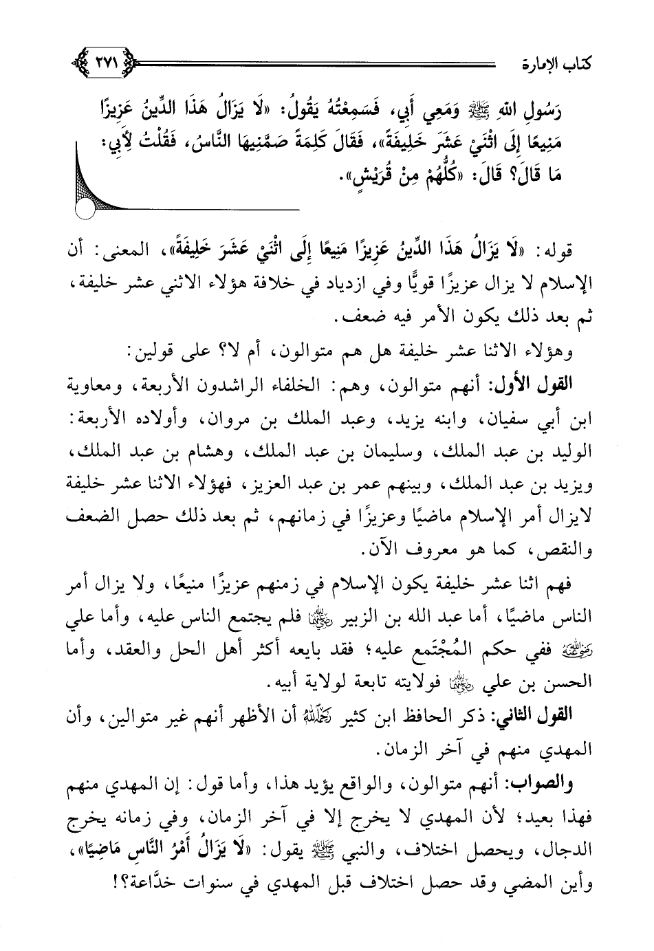 رَسُولِ اللهِ صلى الله عليه وسلم وَمَعِي أَبِي، فَسَمِعْتُهُ يَقُولُ: ((لَا يَزَالُ هَذَا الدِّينُ عَزِيزًا مَنِيعًا إِلَى اثْنَيْ عَشَرَ خَلِيفَةً))، فَقَالَ كَلِمَةً صَمَّنِيهَا النَّاسُ، فَقُلْتُ لِأَبِي: مَا قَالَ؟ قَالَ: ((كُلُّهُمْ مِنْ قُرَيْشٍ)).