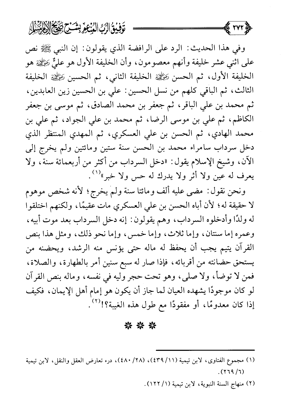 وفي الحديث: الرد على الرافضة الذي يقولون: إن النبي صلى الله عليه وسلم نص على اثني عشر خليفة وأنهم معصومون، وأن الخليفة الأول هو عليٌّ رضي الله عنه هو الخليفة الأول، ثم الحسن رضي الله عنه الخليفة الثاني، ثم الحسين رضي الله عنه الخليفة الثالث، ثم الباقي كلهم من نسل الحسين: علي بن الحسين زين العابدين، ثم محمد بن علي الباقر، ثم جعفر بن محمد الصادق، ثم موسى بن جعفر الكاظم، ثم علي بن موسى الرضا، ثم محمد بن علي الجواد، ثم علي بن محمد الهادي، ثم الحسن بن علي العسكري، ثم المهدي المنتظر الذي دخل سرداب سامراء محمد بن الحسن سنة ستين ومائتين ولم يخرج إلى الآن، وشيخ الإسلام يقول: ((دخل السرداب من أكثر من أربعمائة سنة، ولا يعرف له عين ولا أثر ولا يدرك له حس ولا خبر)) (¬١)، ونحن نقول: مضى عليه ألف ومائتا سنة ولم يخرج، لأنه شخص موهوم لا حقيقة له؛ لأن أباه الحسن بن علي العسكري مات عقيمًا، ولكنهم اختلقوا له ولدًا وأدخلوه السرداب، وهم يقولون: إنه دخل السرداب بعد موت أبيه، وعمره إما سنتان، وإما ثلاث، وإما خمس، وإما نحو ذلك، ومثل هذا بنص القرآن يتيم يجب أن يحفظ له ماله حتى يؤنس منه الرشد، ويحضنه من يستحق حضانته من أقربائه، فإذا صار له سبع سنين أمر بالطهارة، والصلاة، فمن لا توضأ، ولا صلى، وهو تحت حجر وليه في نفسه، وماله بنص القرآن لو كان موجودا يشهده العيان لما جاز أن يكون هو إمام أهل الإيمان، فكيف إذا كان معدوما، أو مفقودا مع طول هذه الغيبة؟ ! (¬٢).