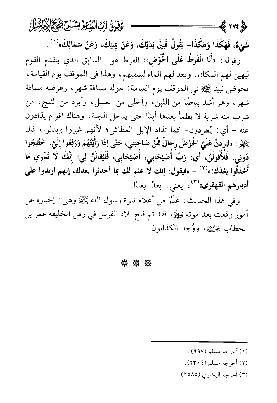 وقوله: ((أَنَا الْفَرَطُ عَلَى الْحَوْضِ)) الفرط هو: السابق الذي يتقدم القوم ليهيئ لهم المكان، ويعد لهم الماء ليسقيهم، وهذا في الموقف يوم القيامة، فحوض نبينا صلى الله عليه وسلم في الموقف يوم القيامة: طوله مسافة شهر، وعرضه مسافة شهر، وهو أشد بياضًا من اللبن، وأحلى من العسل، وأبرد من الثلج، من شرب منه شربة لا يظمأ بعدها أبدًا حتى يدخل الجنة، وهناك أقوام يذادون عنه - أي: يُطردون- كما تذاد الإبل العطاش؛ لأنهم غيروا وبدلوا، قال صلى الله عليه وسلم: ((ليردن علي أقوام أعرفهم ويعرفوني، ثم يحال بيني وبينهم، فأقول: إنهم مني، فيقال: إنك لا تدري ما أحدثوا بعدك، فأقول: سحقًا سحقًا لمن غير بعدي))، وفي نفس الحديث: ((يرد علي يوم القيامة رهط من أصحابي فيجلون عن الحوض، فأقول: يا رب أصحابي)) - وفي لفظ: ((أصيحابي أصيحابي)) (¬٢) - ((فيقول: إنك لا علم لك بما أحدثوا بعدك، إنهم ارتدوا على أدبارهم القهقرى)) (¬٣)، يعني: بعدًا بعدًا.