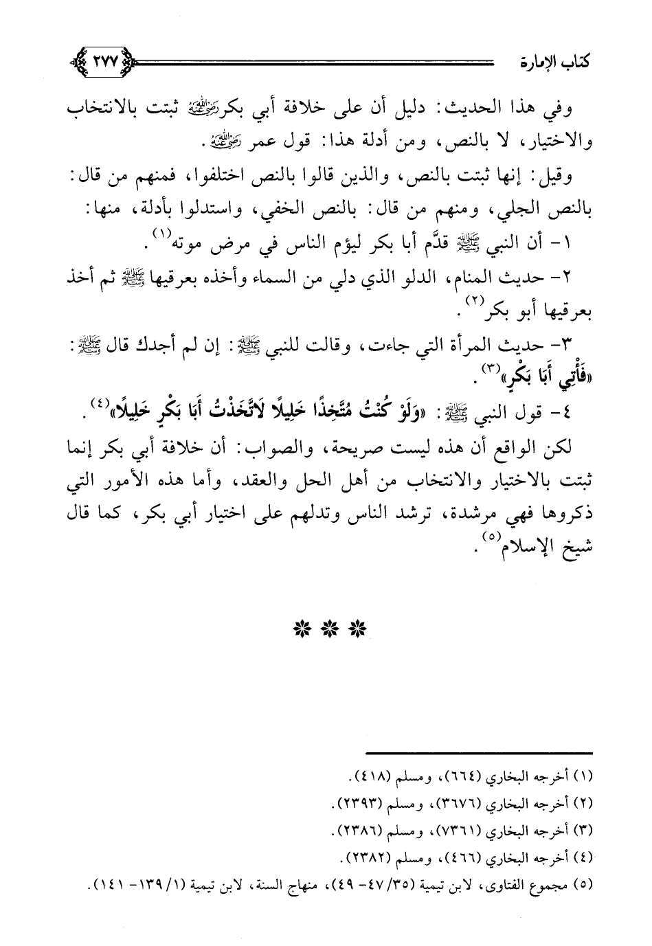 لكن الواقع أن هذه ليست صريحة، والصواب: أن خلافة أبي بكر إنما ثبتت بالاختيار والانتخاب من أهل الحل والعقد، وأما هذه الأمور التي ذكروها فهي مرشدة، ترشد الناس وتدلهم على اختيار أبي بكر، كما قال شيخ الإسلام (¬٥).