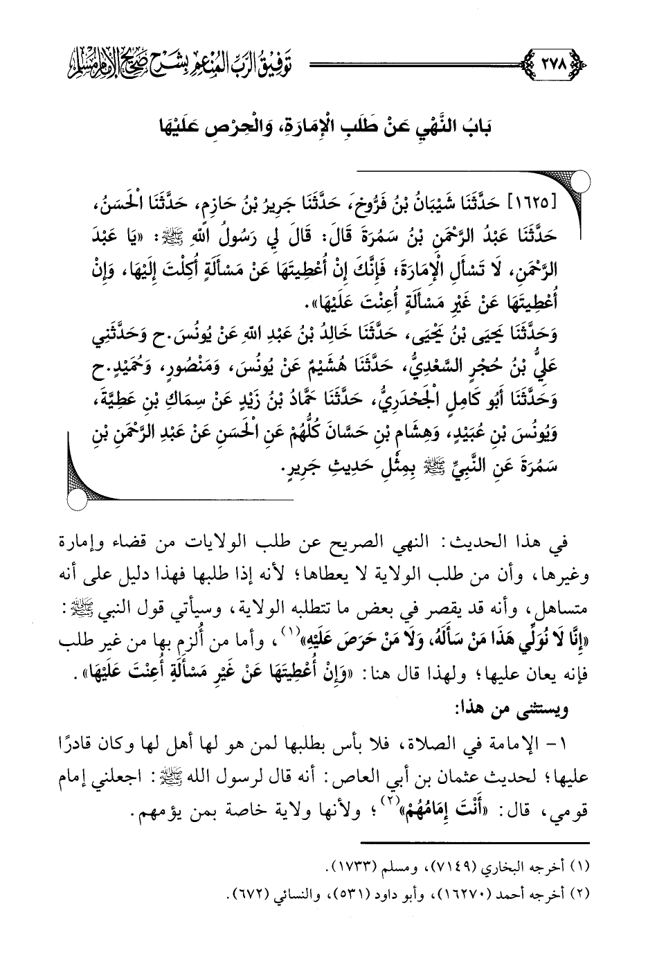 [١٦٢٥] حَدَّثَنَا شَيْبَانُ بْنُ فَرُّوخَ، حَدَّثَنَا جَرِيرُ بْنُ حَازِمٍ، حَدَّثَنَا الْحَسَنُ، حَدَّثَنَا عَبْدُ الرَّحْمَنِ بْنُ سَمُرَةَ قَالَ: قَالَ لِي رَسُولُ اللهِ صلى الله عليه وسلم: ((يَا عَبْدَ الرَّحْمَنِ، لَا تَسْأَلِ الْإِمَارَةَ؛ فَإِنَّكَ إِنْ أُعْطِيتَهَا عَنْ مَسْأَلَةٍ أُكِلْتَ إِلَيْهَا، وَإِنْ أُعْطِيتَهَا عَنْ غَيْرِ مَسْأَلَةٍ أُعِنْتَ عَلَيْهَا)).