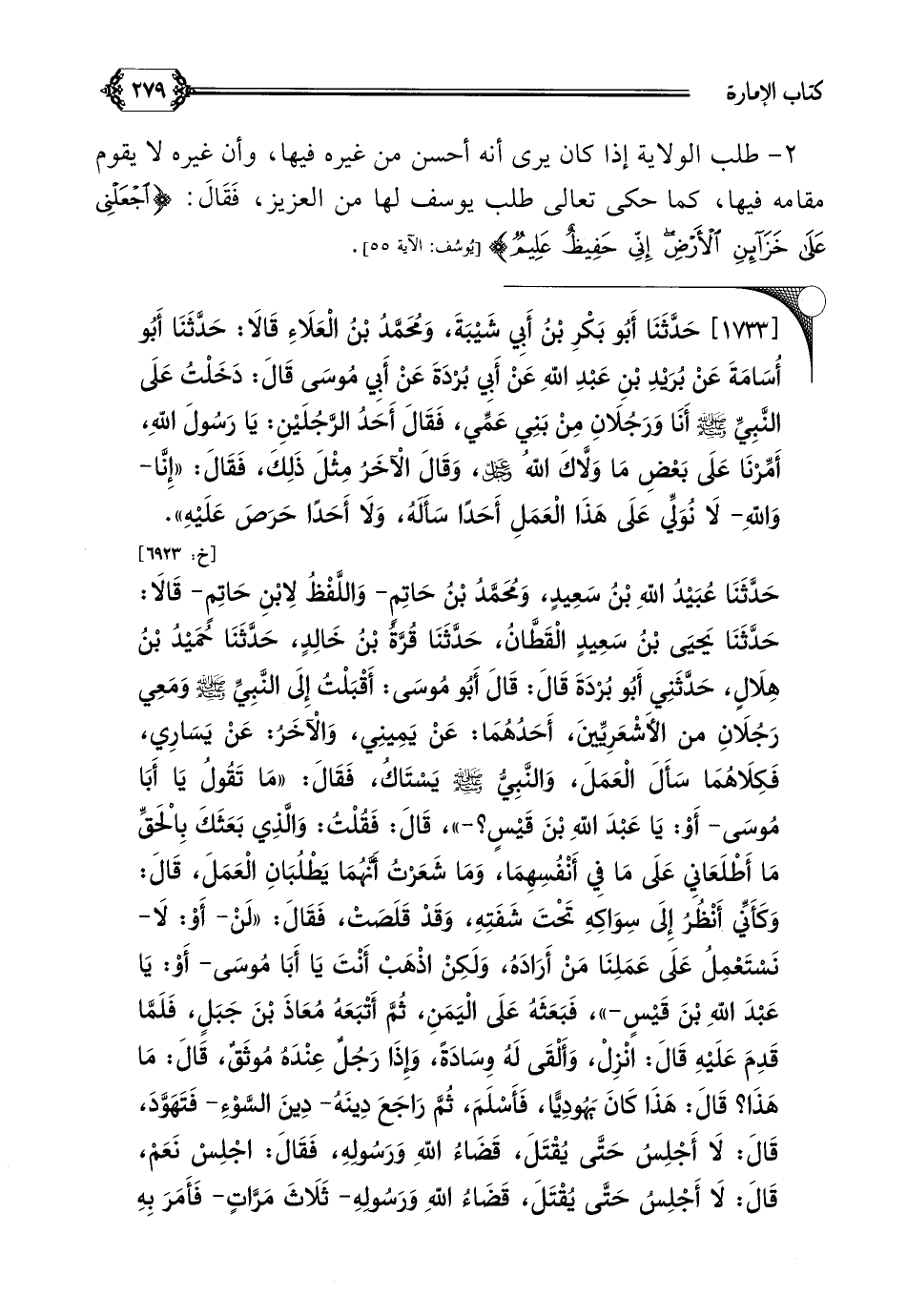 [١٧٣٣] حَدَّثَنَا أَبُو بَكْرِ بْنُ أَبِي شَيْبَةَ، وَمُحَمَّدُ بْنُ الْعَلَاءِ قَالَا: حَدَّثَنَا أَبُو أُسَامَةَ عَنْ بُرَيْدِ بْنِ عَبْدِ اللهِ عَنْ أَبِي بُرْدَةَ عَنْ أَبِي مُوسَى قَالَ: دَخَلْتُ عَلَى النَّبِيِّ صلى الله عليه وسلم أَنَا وَرَجُلَانِ مِنْ بَنِي عَمِّي، فَقَالَ أَحَدُ الرَّجُلَيْنِ: يَا رَسُولَ اللهِ، أَمِّرْنَا عَلَى بَعْضِ مَا وَلَّاكَ اللهُ عز وجل، وَقَالَ الْآخَرُ مِثْلَ ذَلِكَ، فَقَالَ: ((إِنَّا- وَاللهِ- لَا نُوَلِّي عَلَى هَذَا الْعَمَلِ أَحَدًا سَأَلَهُ، وَلَا أَحَدًا حَرَصَ عَلَيْهِ)).
