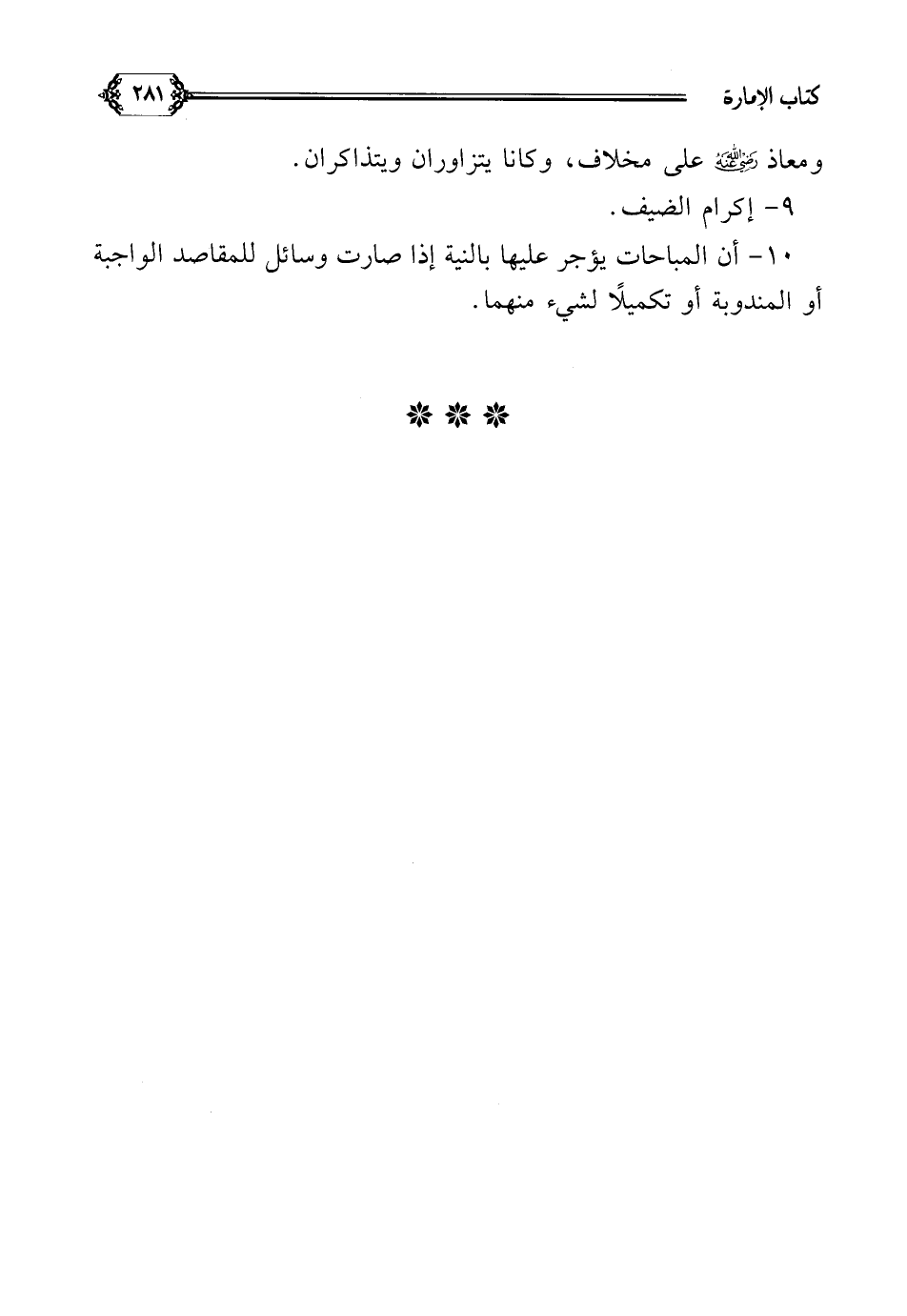 ١٠ - أن المباحات يؤجر عليها بالنية إذا صارت وسائل للمقاصد الواجبة أو المندوبة أو تكميلًا لشيء منهما.