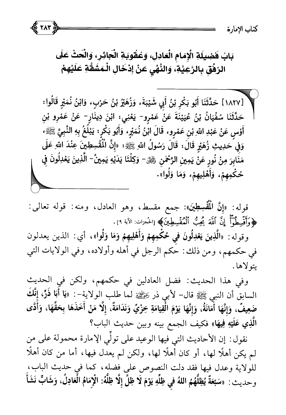 [١٨٢٧] حَدَّثَنَا أَبُو بَكْرِ بْنُ أَبِي شَيْبَةَ، وَزُهَيْرُ بْنُ حَرْبٍ، وَابْنُ نُمَيْرٍ قَالُوا: حَدَّثَنَا سُفْيَانُ بْنُ عُيَيْنَةَ عَنْ عَمْرٍو- يَعْنِي: ابْنَ دِينَارٍ- عَنْ عَمْرِو بْنِ أَوْسٍ عَنْ عَبْدِ اللهِ بْنِ عَمْرٍو، قَالَ ابْنُ نُمَيْرٍ، وَأَبُو بَكْرٍ: يَبْلُغُ بِهِ النَّبِيَّ صلى الله عليه وسلم، وَفِي حَدِيثِ زُهَيْرٍ قَالَ: قَالَ رَسُولُ اللهِ صلى الله عليه وسلم: ((إِنَّ الْمُقْسِطِينَ عِنْدَ اللهِ عَلَى مَنَابِرَ مِنْ نُورٍ عَنْ يَمِينِ الرَّحْمَنِ عز وجل- وَكِلْتَا يَدَيْهِ يَمِينٌ- الَّذِينَ يَعْدِلُونَ فِي حُكْمِهِمْ، وَأَهْلِيهِمْ، وَمَا وَلُوا)).