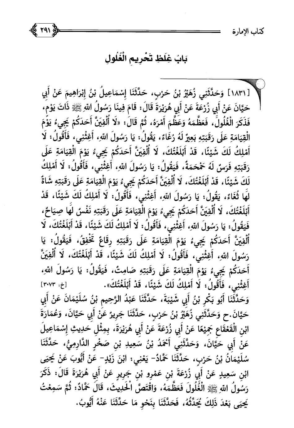 [١٨٣١] وَحَدَّثَنِي زُهَيْرُ بْنُ حَرْبٍ، حَدَّثَنَا إِسْمَاعِيلُ بْنُ إِبْرَاهِيمَ عَنْ أَبِي حَيَّانَ عَنْ أَبِي زُرْعَةَ عَنْ أَبِي هُرَيْرَةَ قَالَ: قَامَ فِينَا رَسُولُ اللهِ صلى الله عليه وسلم ذَاتَ يَوْمٍ، فَذَكَرَ الْغُلُولَ، فَعَظَّمَهُ وَعَظَّمَ أَمْرَهُ، ثُمَّ قَالَ: ((لَا أُلْفِيَنَّ أَحَدَكُمْ يَجِيءُ يَوْمَ الْقِيَامَةِ عَلَى رَقَبَتِهِ بَعِيرٌ لَهُ رُغَاءٌ، يَقُولُ: يَا رَسُولَ اللهِ، أَغِثْنِي، فَأَقُولُ: لَا أَمْلِكُ لَكَ شَيْئًا، قَدْ أَبْلَغْتُكَ، لَا أُلْفِيَنَّ أَحَدَكُمْ يَجِيءُ يَوْمَ الْقِيَامَةِ عَلَى رَقَبَتِهِ فَرَسٌ لَهُ حَمْحَمَةٌ، فَيَقُولُ: يَا رَسُولَ اللهِ، أَغِثْنِي، فَأَقُولُ: لَا أَمْلِكُ لَكَ شَيْئًا، قَدْ أَبْلَغْتُكَ، لَا أُلْفِيَنَّ أَحَدَكُمْ يَجِيءُ يَوْمَ الْقِيَامَةِ عَلَى رَقَبَتِهِ شَاةٌ لَهَا ثُغَاءٌ، يَقُولُ: يَا رَسُولَ اللهِ، أَغِثْنِي، فَأَقُولُ: لَا أَمْلِكُ لَكَ شَيْئًا، قَدْ أَبْلَغْتُكَ، لَا أُلْفِيَنَّ أَحَدَكُمْ يَجِيءُ يَوْمَ الْقِيَامَةِ عَلَى رَقَبَتِهِ نَفْسٌ لَهَا صِيَاحٌ، فَيَقُولُ: يَا رَسُولَ اللهِ، أَغِثْنِي، فَأَقُولُ: لَا أَمْلِكُ لَكَ شَيْئًا، قَدْ أَبْلَغْتُكَ، لَا أُلْفِيَنَّ أَحَدَكُمْ يَجِيءُ يَوْمَ الْقِيَامَةِ عَلَى رَقَبَتِهِ رِقَاعٌ تَخْفِقُ، فَيَقُولُ: يَا رَسُولَ اللهِ، أَغِثْنِي، فَأَقُولُ: لَا أَمْلِكُ لَكَ شَيْئًا، قَدْ أَبْلَغْتُكَ، لَا أُلْفِيَنَّ أَحَدَكُمْ يَجِيءُ يَوْمَ الْقِيَامَةِ عَلَى رَقَبَتِهِ صَامِتٌ، فَيَقُولُ: يَا رَسُولَ اللهِ، أَغِثْنِي، فَأَقُولُ: لَا أَمْلِكُ لَكَ شَيْئًا، قَدْ أَبْلَغْتُكَ)).