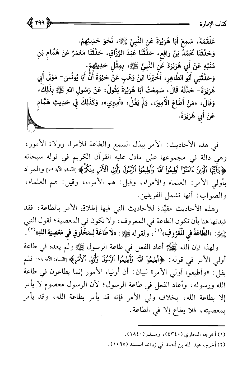 وهذه الأحاديث مقيِّدة للأحاديث التي فيها إطلاق الأمر بالطاعة، فقد قيدتها هنا بأن تكون الطاعة في المعروف، ولا تكون في المعصية؛ لقول النبي عليه الصلاة والسلام: ((الطَّاعَةُ فِي الْمَعْرُوفِ)) (¬١)، ولقوله عليه الصلاة والسلام: ((لَا طَاعَةَ لِمَخْلُوقٍ فِي مَعْصِيَةِ اللهِ)) (¬٢).