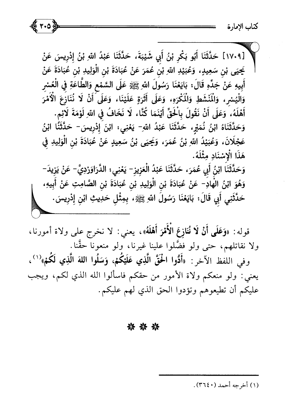[١٧٠٩] حَدَّثَنَا أَبُو بَكْرِ بْنُ أَبِي شَيْبَةَ، حَدَّثَنَا عَبْدُ اللهِ بْنُ إِدْرِيسَ عَنْ يَحيَى بْنِ سَعِيدٍ، وَعُبَيْدِ اللهِ بْنِ عُمَرَ عَنْ عُبَادَةَ بْنِ الْوَلِيدِ بْنِ عُبَادَةَ عَنْ أَبِيهِ عَنْ جَدِّهِ قَالَ: بَايَعْنَا رَسُولَ اللهِ صلى الله عليه وسلم عَلَى السَّمْعِ وَالطَّاعَةِ فِي الْعُسْرِ وَالْيُسْرِ، وَالْمَنْشَطِ وَالْمَكْرَهِ، وَعَلَى أَثَرَةٍ عَلَيْنَا، وَعَلَى أَنْ لَا نُنَازِعَ الْأَمْرَ أَهْلَهُ، وَعَلَى أَنْ نَقُولَ بِالْحَقِّ أَيْنَمَا كُنَّا، لَا نَخَافُ فِي اللهِ لَوْمَةَ لَائِمٍ.