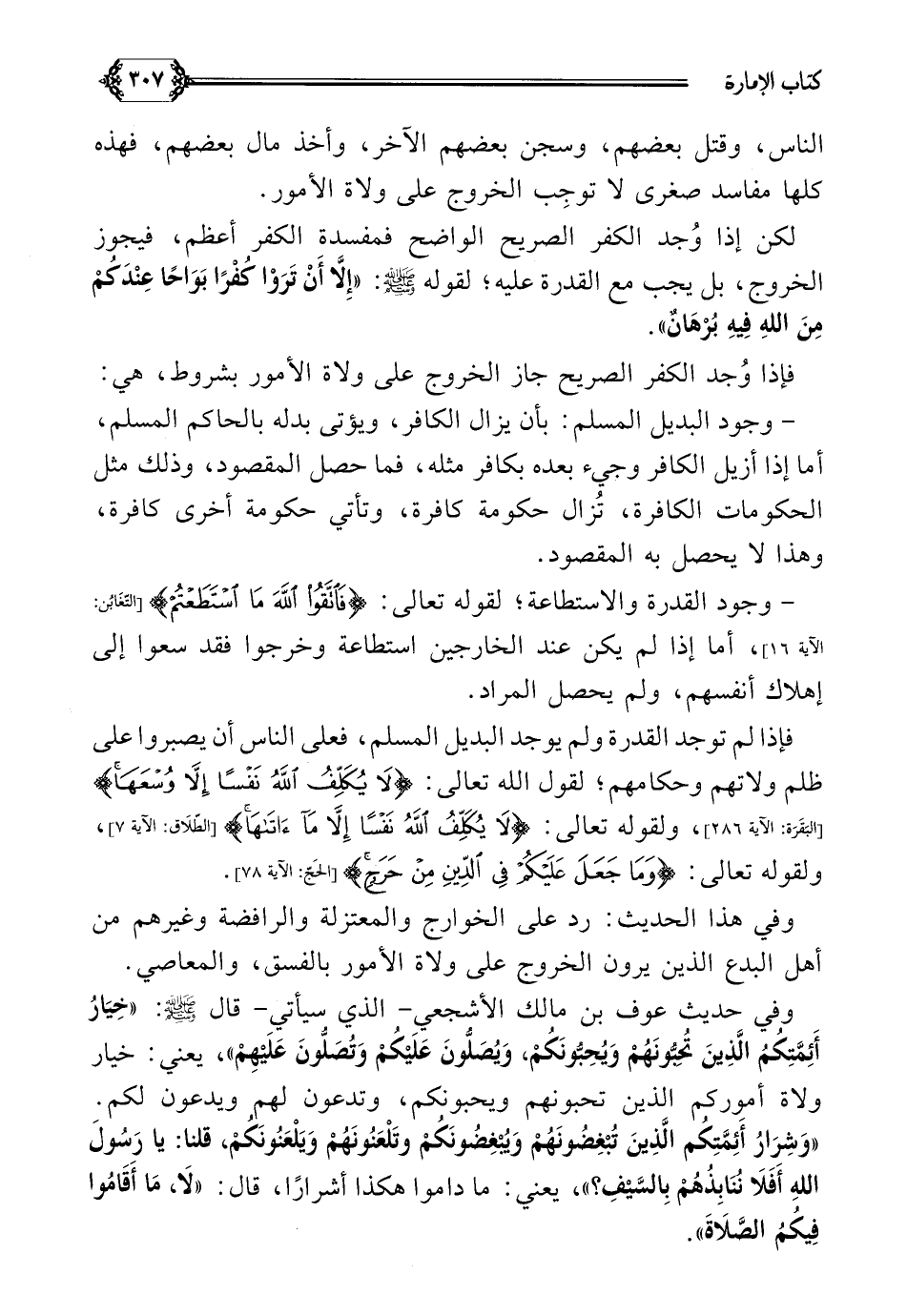 وفي حديث عوف بن مالك الأشجعي- الذي سيأتي- قال عليه الصلاة والسلام: ((خِيَارُ أَئِمَّتِكُمُ الَّذِينَ تُحِبُّونَهُمْ وَيُحِبُّونَكُمْ، وَيُصَلُّونَ عَلَيْكُمْ وَتُصَلُّونَ عَلَيْهِمْ))، يعني: خيار ولاة أموركم الذين تحبونهم ويحبونكم، وتدعون لهم ويدعون لكم ((وَشِرَارُ أَئِمَّتِكُم الَّذِينَ تُبْغِضُونَهُمْ وَيُبْغِضُونَكُمْ وتَلْعَنُونَهُمْ وَيَلْعَنُونَكُمْ)) قلنا: ((يا رَسُولَ اللهِ أَفَلَا نُنَابِذُهُمْ بِالسَّيْفِ؟ ))، يعني: ما داموا هكذا أشرارًا، قال: ((لَا، مَا أَقَامُوا فِيكُمُ الصَّلَاةَ)).