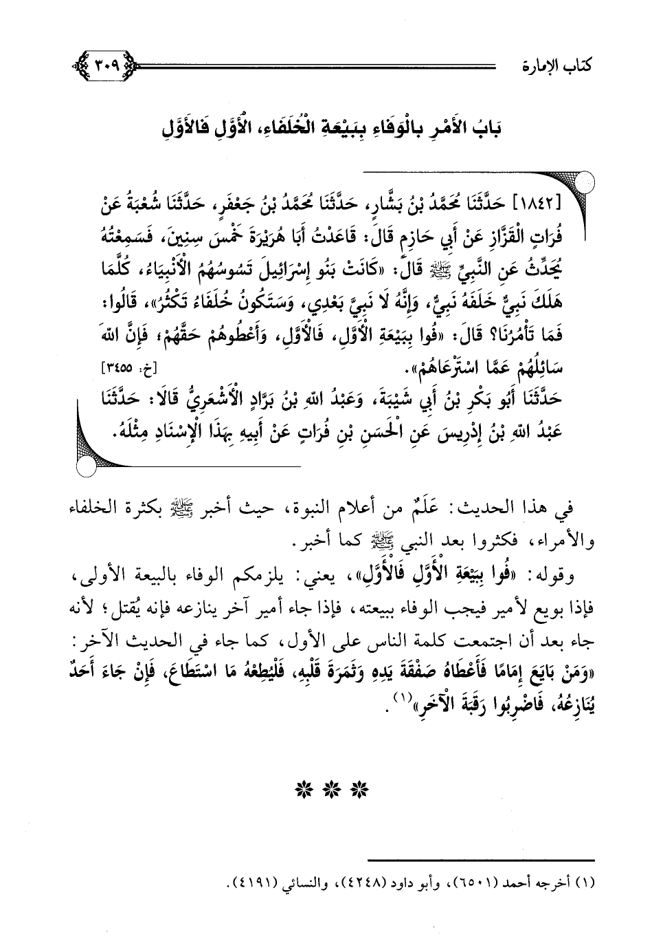 [١٨٤٢] حَدَّثَنَا مُحَمَّدُ بْنُ بَشَّارٍ، حَدَّثَنَا مُحَمَّدُ بْنُ جَعْفَرٍ، حَدَّثَنَا شُعْبَةُ عَنْ فُرَاتٍ الْقَزَّازِ عَنْ أَبِي حَازِمٍ قَالَ: قَاعَدْتُ أَبَا هُرَيْرَةَ خَمْسَ سِنِينَ، فَسَمِعْتُهُ يُحَدِّثُ عَنِ النَّبِيِّ صلى الله عليه وسلم قَالَ: ((كَانَتْ بَنُو إِسْرَائِيلَ تَسُوسُهُمُ الْأَنْبِيَاءُ، كُلَّمَا هَلَكَ نَبِيٌّ خَلَفَهُ نَبِيٌّ، وَإِنَّهُ لَا نَبِيَّ بَعْدِي، وَسَتَكُونُ خُلَفَاءُ تَكْثُرُ))، قَالُوا: فَمَا تَأْمُرُنَا؟ قَالَ: ((فُوا بِبَيْعَةِ الْأَوَّلِ، فَالْأَوَّلِ، وَأَعْطُوهُمْ حَقَّهُمْ؛ فَإِنَّ اللهَ سَائِلُهُمْ عَمَّا اسْتَرْعَاهُمْ)).