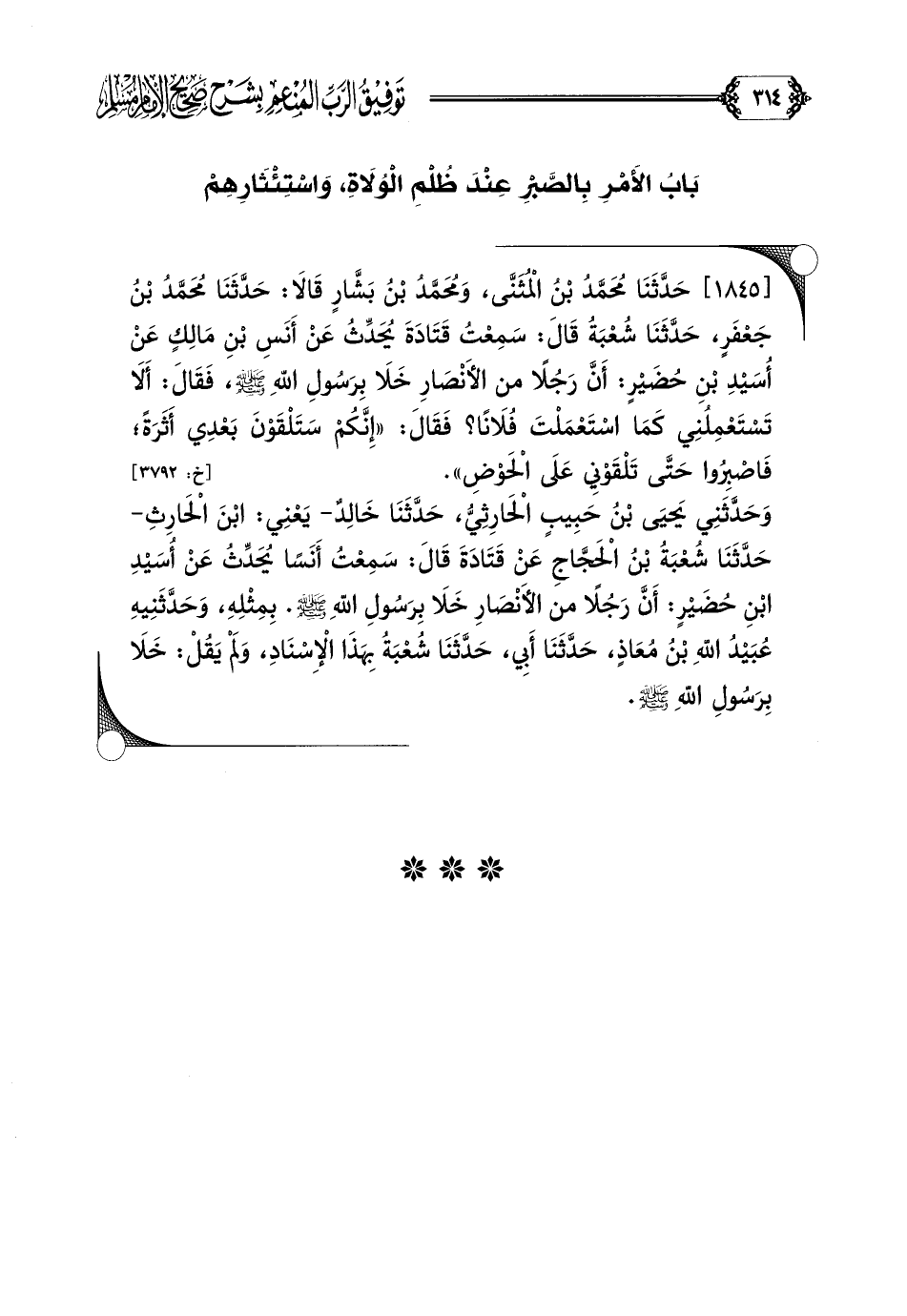 [١٨٤٥] حَدَّثَنَا مُحَمَّدُ بْنُ الْمُثَنَّى، وَمُحَمَّدُ بْنُ بَشَّارٍ قَالَا: حَدَّثَنَا مُحَمَّدُ بْنُ جَعْفَرٍ، حَدَّثَنَا شُعْبَةُ قَالَ: سَمِعْتُ قَتَادَةَ يُحَدِّثُ عَنْ أَنَسِ بْنِ مَالِكٍ عَنْ أُسَيْدِ بْنِ حُضَيْرٍ: أَنَّ رَجُلًا من الأَنْصَارِ خَلَا بِرَسُولِ اللهِ صلى الله عليه وسلم، فَقَالَ: أَلَا تَسْتَعْمِلُنِي كَمَا اسْتَعْمَلْتَ فُلَانًا؟ فَقَالَ: ((إِنَّكُمْ سَتَلْقَوْنَ بَعْدِي أَثَرَةً؛ فَاصْبِرُوا حَتَّى تَلْقَوْنِي عَلَى الْحَوْضِ)).