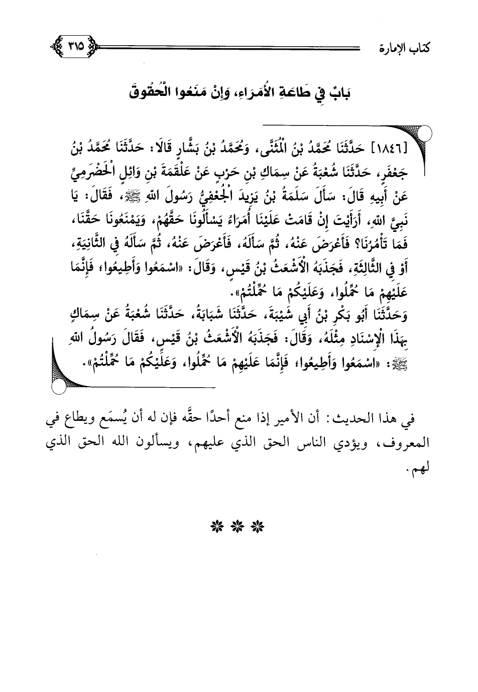 [١٨٤٦] حَدَّثَنَا مُحَمَّدُ بْنُ الْمُثَنَّى، وَمُحَمَّدُ بْنُ بَشَّارٍ قَالَا: حَدَّثَنَا مُحَمَّدُ بْنُ جَعْفَرٍ، حَدَّثَنَا شُعْبَةُ عَنْ سِمَاكِ بْنِ حَرْبٍ عَنْ عَلْقَمَةَ بْنِ وَائِلٍ الْحَضْرَمِيِّ عَنْ أَبِيهِ قَالَ: سَأَلَ سَلَمَةُ بْنُ يَزِيدَ الْجُعْفِيُّ رَسُولَ اللهِ صلى الله عليه وسلم، فَقَالَ: يَا نَبِيَّ اللهِ، أَرَأَيْتَ إِنْ قَامَتْ عَلَيْنَا أُمَرَاءُ يَسْأَلُونَا حَقَّهُمْ، وَيَمْنَعُونَا حَقَّنَا، فَمَا تَأْمُرُنَا؟ فَأَعْرَضَ عَنْهُ، ثُمَّ سَأَلَهُ، فَأَعْرَضَ عَنْهُ، ثُمَّ سَأَلَهُ فِي الثَّانِيَةِ، أَوْ فِي الثَّالِثَةِ، فَجَذَبَهُ الْأَشْعَثُ بْنُ قَيْسٍ، وَقَالَ: ((اسْمَعُوا وَأَطِيعُوا؛ فَإِنَّمَا عَلَيْهِمْ مَا حُمِّلُوا، وَعَلَيْكُمْ مَا حُمِّلْتُمْ)).