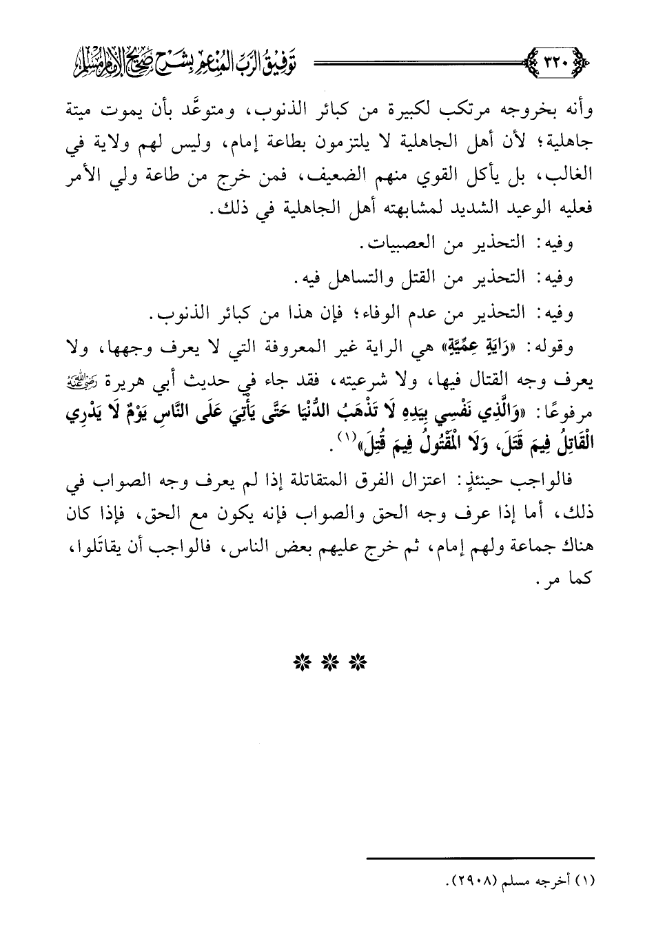 وأنه بخروجه مرتكب لكبيرة من كبائر الذنوب، ومتوعَّد بأن يموت ميتة جاهلية؛ لأن أهل الجاهلية لا يلتزمون بطاعة إمام، وليس لهم ولاية في الغالب، بل يأكل القوي منهم الضعيف، فمن خرج من طاعة ولي الأمر فعليه الوعيد الشديد لمشابهته أهل الجاهلية في ذلك.
