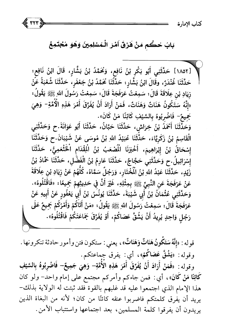 [١٨٥٢] حَدَّثَنِي أَبُو بَكْرِ بْنُ نَافِعٍ، وَمُحَمَّدُ بْنُ بَشَّارٍ، قَالَ ابْنُ نَافِعٍ: حَدَّثَنَا غُنْدَرٌ، وقَالَ ابْنُ بَشَّارٍ: حَدَّثَنَا مُحَمَّدُ بْنُ جَعْفَرٍ، حَدَّثَنَا شُعْبَةُ عَنْ زِيَادِ بْنِ عِلَاقَةَ قَالَ: سَمِعْتُ عَرْفَجَةَ قَالَ: سَمِعْتُ رَسُولَ اللهِ صلى الله عليه وسلم يَقُولُ: ((إِنَّهُ سَتَكُونُ هَنَاتٌ وَهَنَاتٌ، فَمَنْ أَرَادَ أَنْ يُفَرِّقَ أَمْرَ هَذِهِ الْأُمَّةِ- وَهِيَ جَمِيعٌ- فَاضْرِبُوهُ بِالسَّيْفِ كَائِنًا مَنْ كَانَ)).