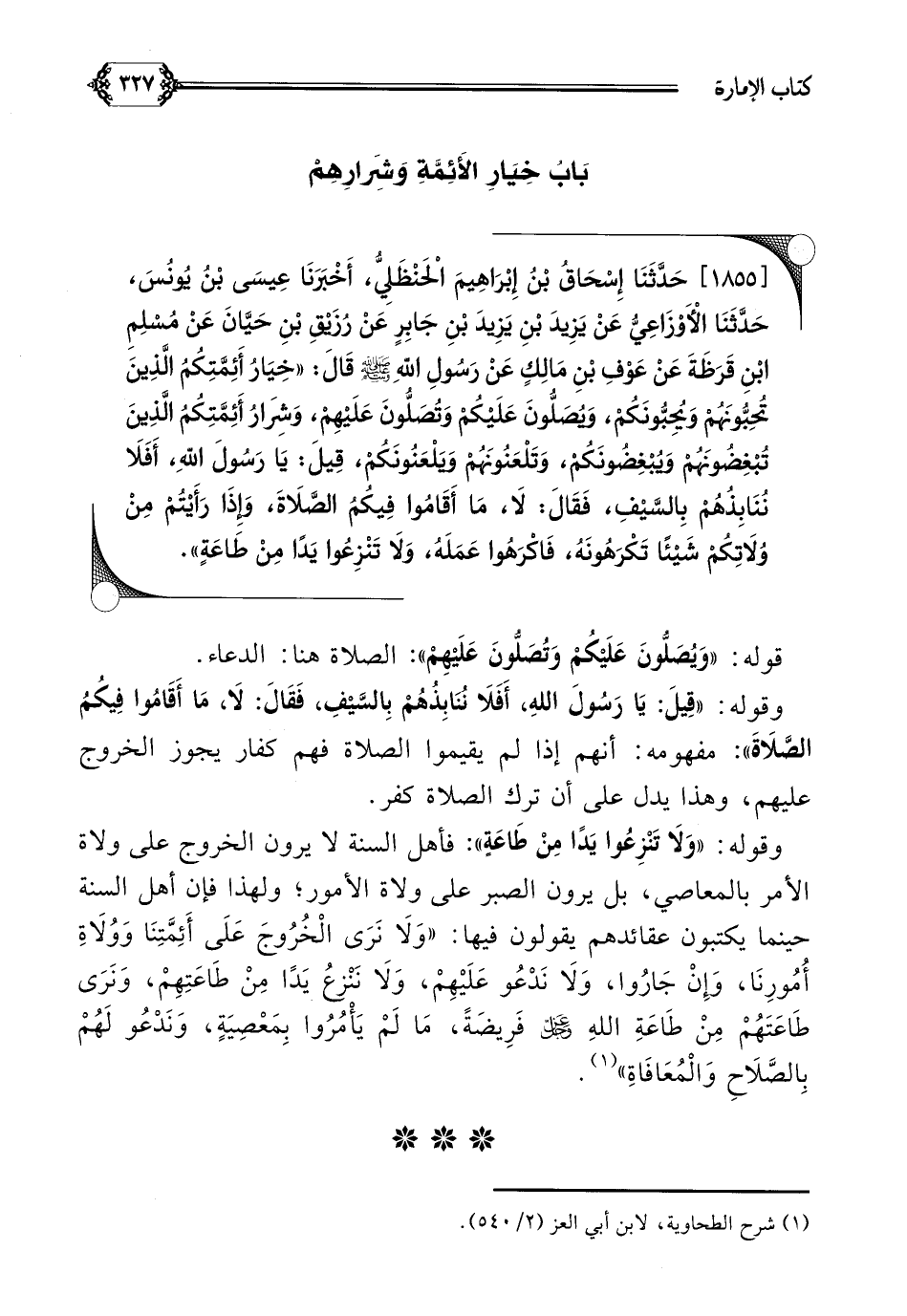 [١٨٥٥] حَدَّثَنَا إِسْحَاقُ بْنُ إِبْرَاهِيمَ الْحَنْظَلِيُّ، أَخْبَرَنَا عِيسَى بْنُ يُونُسَ، حَدَّثَنَا الْأَوْزَاعِيُّ عَنْ يَزِيدَ بْنِ يَزِيدَ بْنِ جَابِرٍ عَنْ رُزَيْقِ بْنِ حَيَّانَ عَنْ مُسْلِمِ بْنِ قَرَظَةَ عَنْ عَوْفِ بْنِ مَالِكٍ عَنْ رَسُولِ اللهِ صلى الله عليه وسلم قَالَ: ((خِيَارُ أَئِمَّتِكُمُ الَّذِينَ تُحِبُّونَهُمْ وَيُحِبُّونَكُمْ، وَيُصَلُّونَ عَلَيْكُمْ وَتُصَلُّونَ عَلَيْهِمْ، وَشِرَارُ أَئِمَّتِكُمُ الَّذِينَ تُبْغِضُونَهُمْ وَيُبْغِضُونَكُمْ، وَتَلْعَنُونَهُمْ وَيَلْعَنُونَكُمْ، قِيلَ: يَا رَسُولَ اللهِ، أَفَلَا نُنَابِذُهُمْ بِالسَّيْفِ، فَقَالَ: لَا، مَا أَقَامُوا فِيكُمُ الصَّلَاةَ، وَإِذَا رَأَيْتُمْ مِنْ وُلَاتِكُمْ شَيْئًا تَكْرَهُونَهُ، فَاكْرَهُوا عَمَلَهُ، وَلَا تَنْزِعُوا يَدًا مِنْ طَاعَةٍ)).