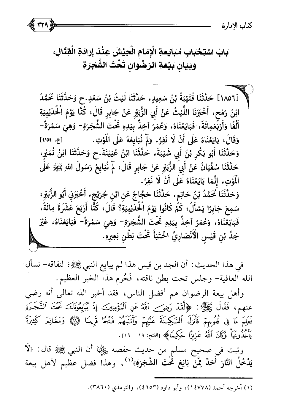 [١٨٥٦] حَدَّثَنَا قُتَيْبَةُ بْنُ سَعِيدٍ، حَدَّثَنَا لَيْثُ بْنُ سَعْدٍ. ح وَحَدَّثَنَا مُحَمَّدُ بْنُ رُمْحٍ، أَخْبَرَنَا اللَّيْثُ عَنْ أَبِي الزُّبَيْرِ عَنْ جَابِرٍ قَالَ: كُنَّا يَوْمَ الْحُدَيْبِيَةِ أَلْفًا وَأَرْبَعَمِائَةً، فَبَايَعْنَاهُ، وَعُمَرُ آخِذٌ بِيَدِهِ تَحْتَ الشَّجَرَةِ- وَهِيَ سَمُرَةٌ- وَقَالَ: بَايَعْنَاهُ عَلَى أَنْ لَا نَفِرَّ، وَلَمْ نُبَايِعْهُ عَلَى الْمَوْتِ.