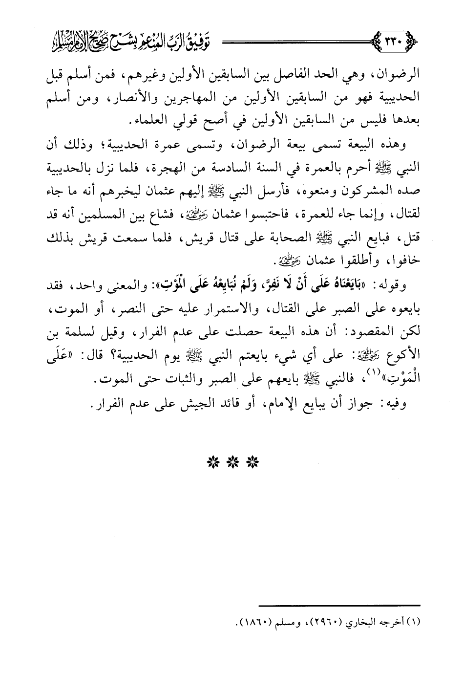 الرضوان، وهي الحد الفاصل بين السابقين الأولين وغيرهم، فمن أسلم قبل الحديبية فهو من السابقين الأولين من المهاجرين والأنصار، ومن أسلم بعدها فليس من السابقين الأولين في أصح قولي العلماء.